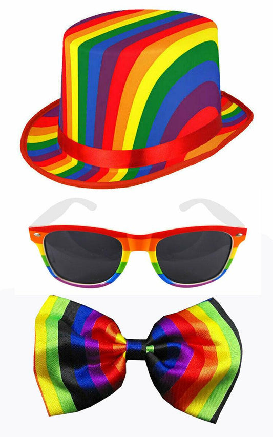 Adults Rainbow Topper Hat Dark Lens Glasses Bow Tie Gay Pride Fancy Dress Set