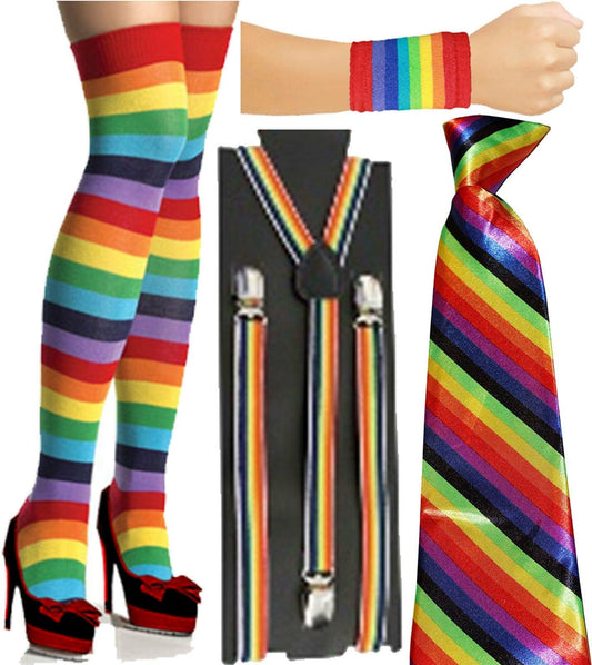 LGBT Gay Pride 1980s Knee Socks Wristband Neck Tie Braces Rainbow Fancy Dress Accessories