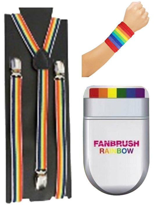 Adults Rainbow Printed Braces Wristband Fan Brush Gay Pride Fancy Dress Set