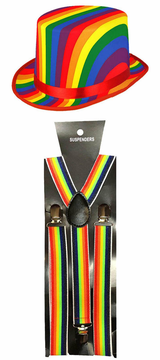 Mens Rainbow Pride Topper Hat Braces Gay Pride Adults Fancy Dress Party Set
