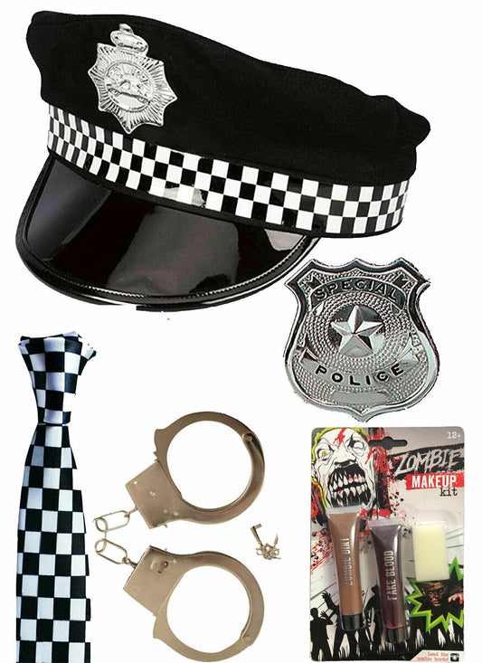 Zombie Police Man Hat, Tie, Cuffs, Badge, Make-Up - Halloween Fancy Dress Party Set"