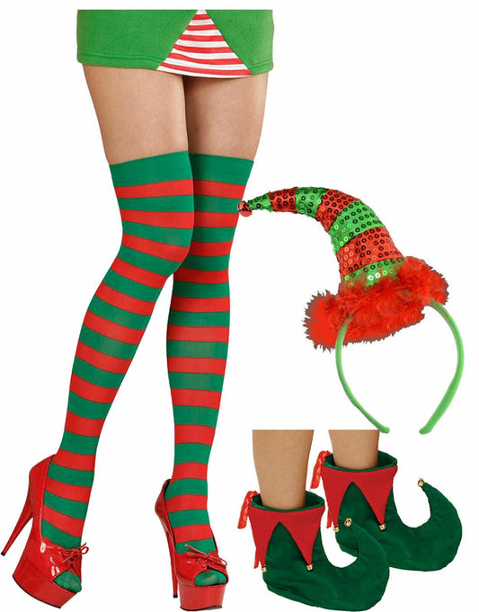 Ladies Sequin Elf Headband Stripy Socks Shoes Christmas Xmas Fancy Dress