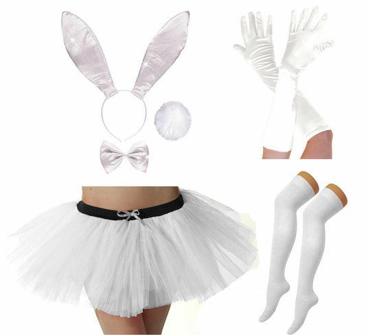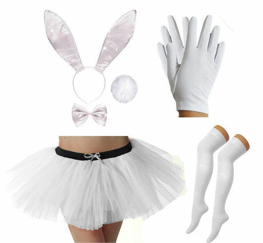 Ladies White Glitter Bunny Set Tutu Socks Gloves Hen Night Party Outfit