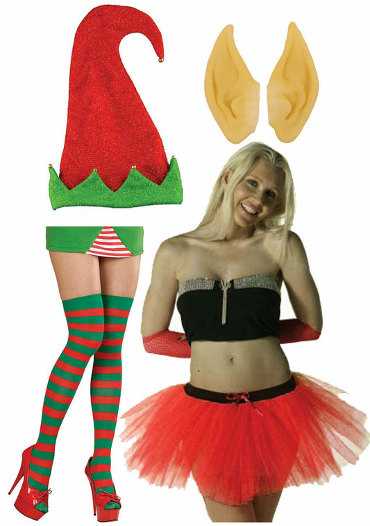 Ladies Elf Santa Helper Sparkly Hat Tutu Socks Ears Christmas Xmas Fancy Dress