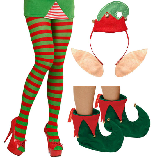 Ladies Christmas Red Green Elf Tights Headbopper Shoe Covers Xmas Party Set