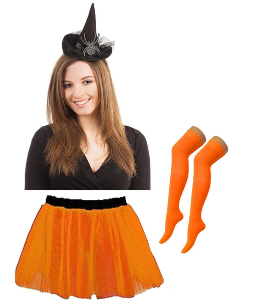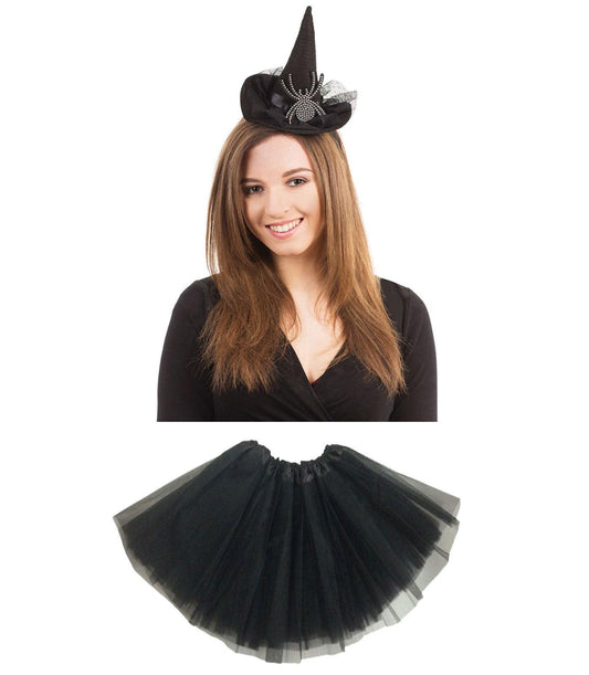 Set: Product Title: Witch Costume Accessories Set for Women & Girls – Includes Witch Hat Headband with Diamante Spider, Wooden-Style Broomstick, Black OTK Socks & 3-Layer Black Tutu Skirt – Halloween Fancy Dress