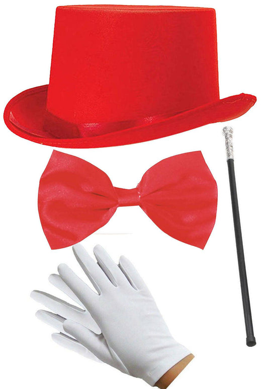 Adults Red Satin Top Hat Snake Cane Dollar Necklace Pimp Party Fancy Dress Set