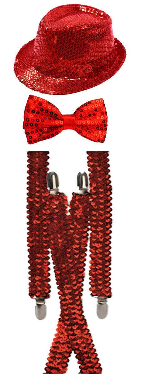 Sparkling Red Sequin Hat Braces Dicky Dickie Bow Tie Fancy Party Accessory Set