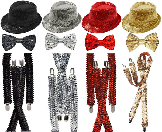 Unisex Sparkly Sequin Hat Braces Dicky Dickie Bow Tie Adults Fancy Dress Set