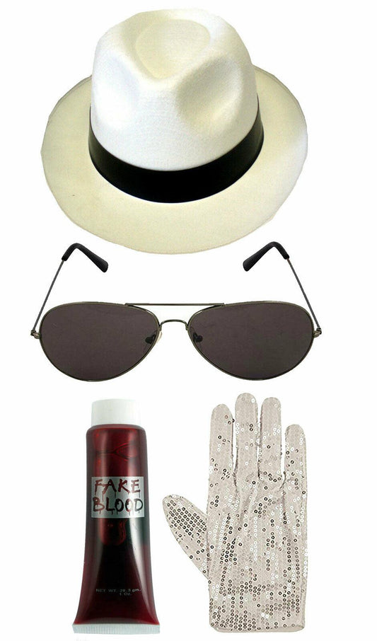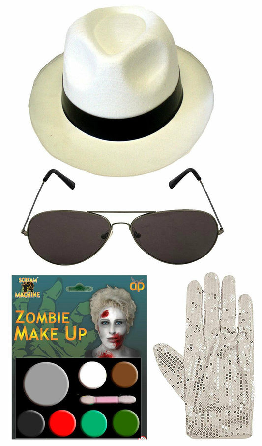 Zombie Michael Jackson White Hat Gloves Glasses Fake Blood Halloween Fancy Dress