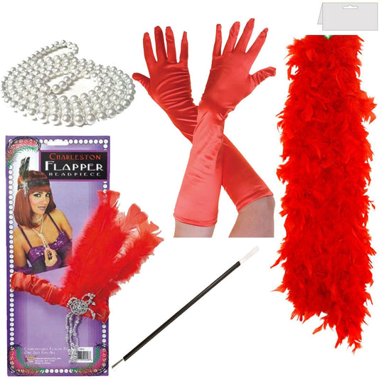 LADIES BOA AND FLAPPER HEADBAND GLOVES RED 1920'S CHARLES FANCY DRESS ACCESSORY