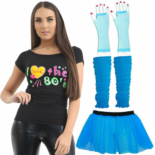 Ladies 3 Layer Tutu T-shirt Gloves Leg Warmers Blue 80s Party Set Neon Festival