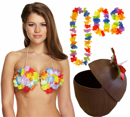 Ladies Girls Hawaiian Flower Hula Bra with 4 Pc Lei Set Beach Party Fancy Dress