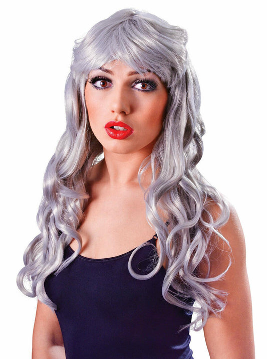Ladies Long Curly Temptress Gothic Grey Wig Halloween Horror Party Accessory