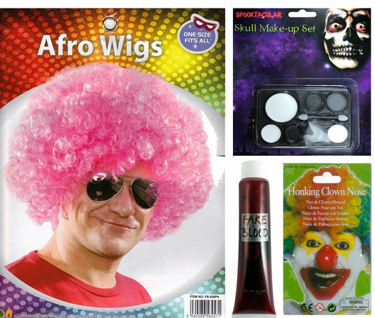Pink Afro Wig Fake Blood Honking Nose Skull Make Up Halloween Lady Clown Set