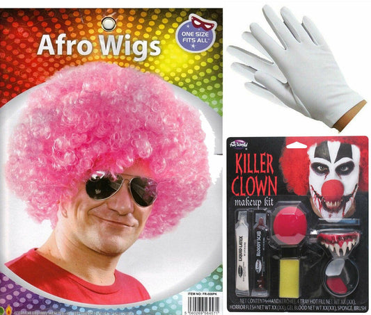 Pink Afro Wig Killer Clown Make Up Short Gloves Halloween Lady Clown Set