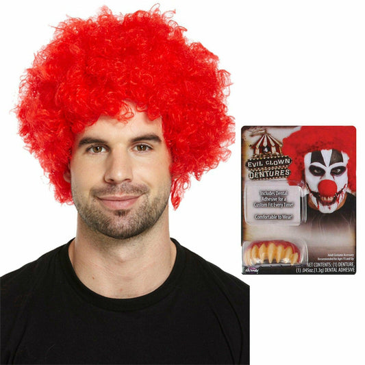 Red Afro Wig with Demon Clown Teeth Denture Halloween Scary Party Set