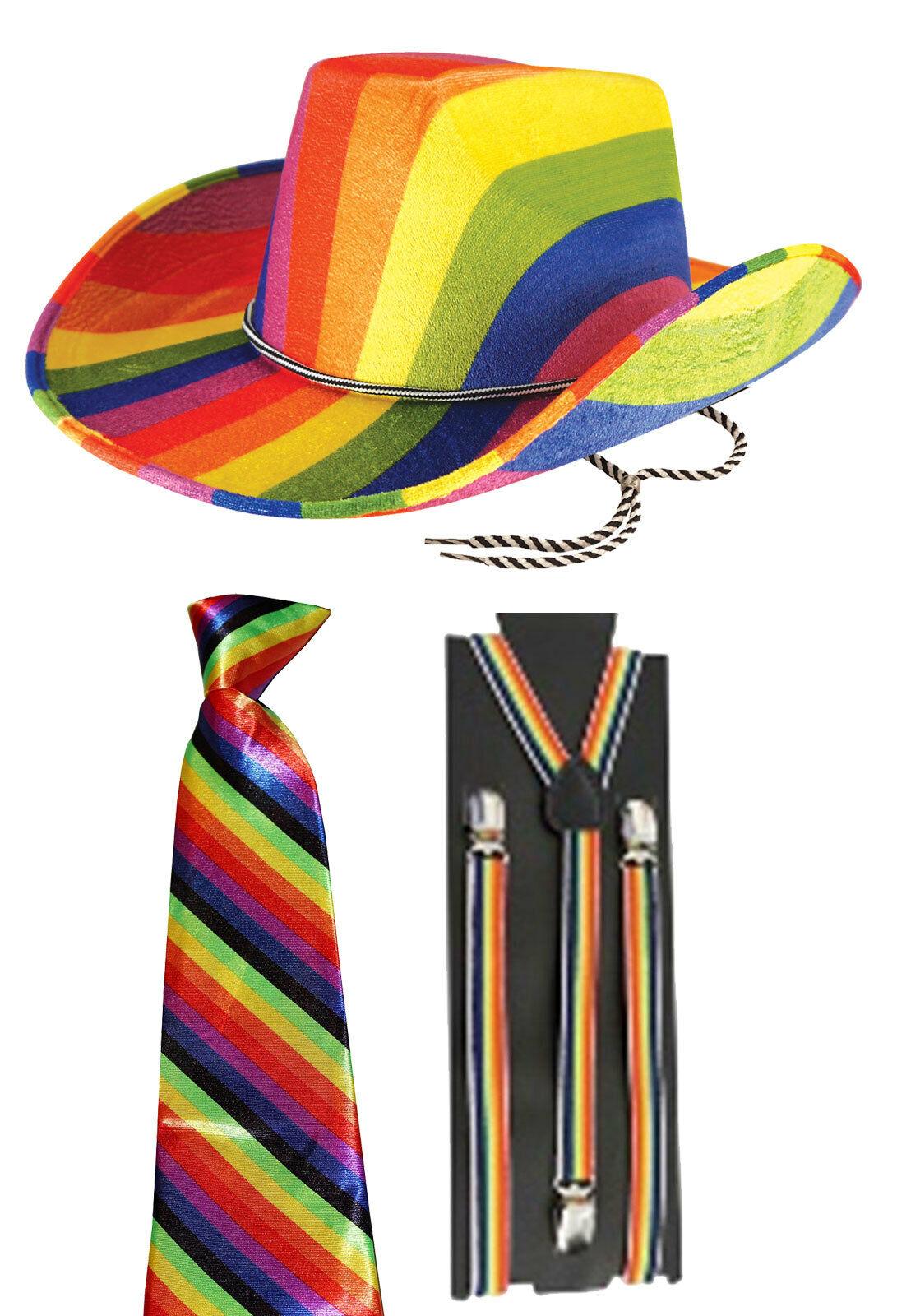 Adults Rainbow Cowboy Felt Hat Striped Neck Tie Braces Gay Pride Fancy Dress Set