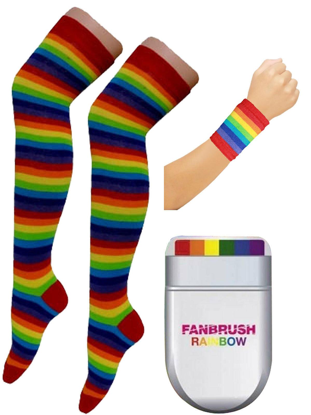 Adults Rainbow OTK Socks Fan Brush Wristband Gay Pride Fancy Dress Set