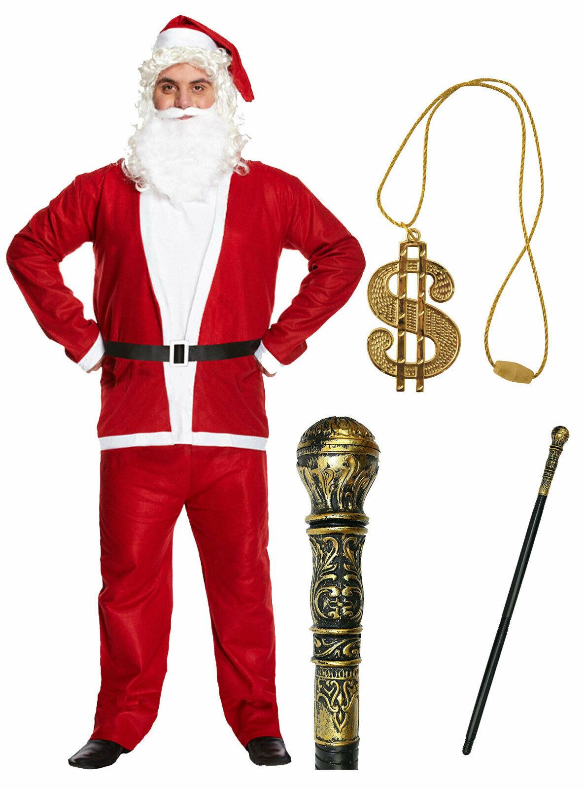 Adults Santa Clause Suit Gold Pimp Cane Dollar Necklace Novelty Xmas Fancy Dress