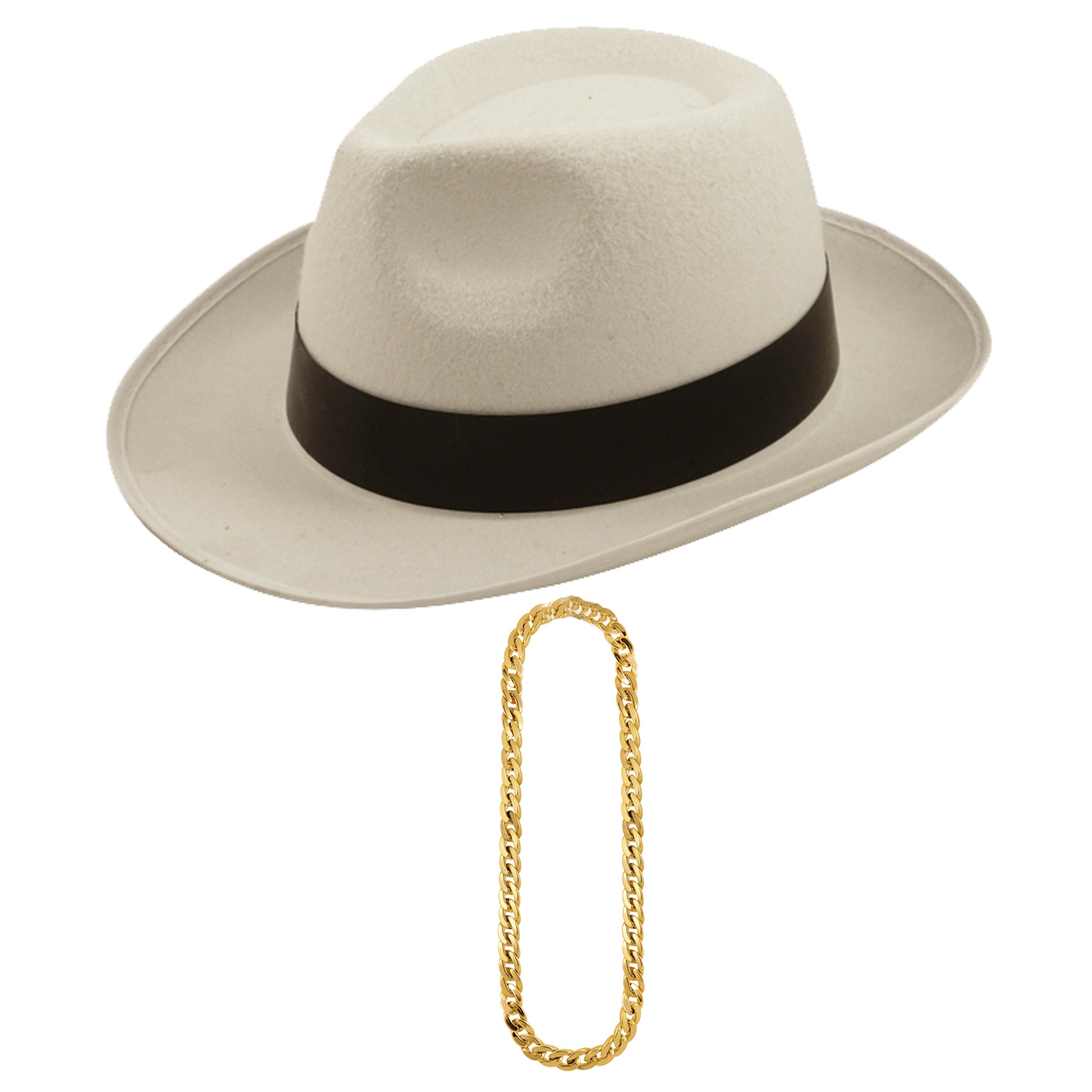 Adults White Gangster Trillby Hat with Gold Gangster Chain 81 Cm 1920’s Pimp Roaring Fancy Dress Set