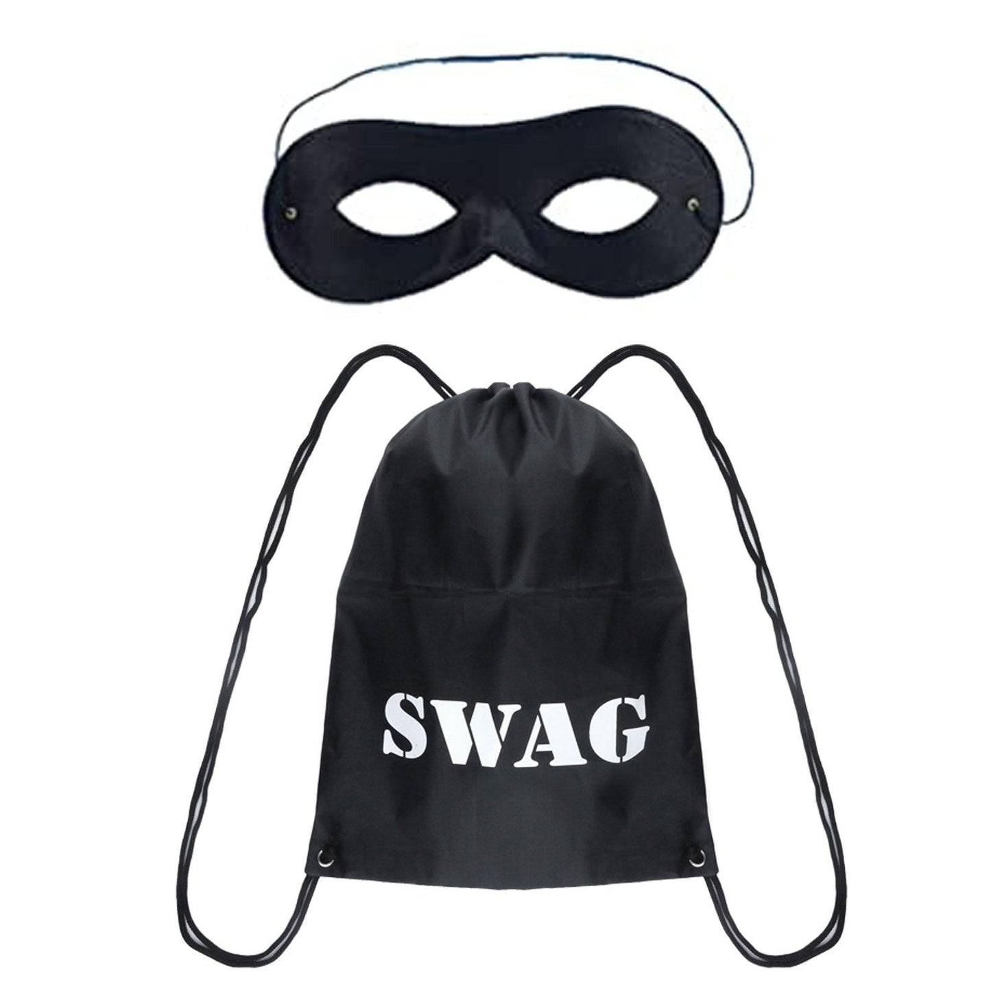 Black Swag Bag with Domino Eye Mask Kit - Unisex Cops and Robbers Burglar Thief Villain Convict World Book Day Set