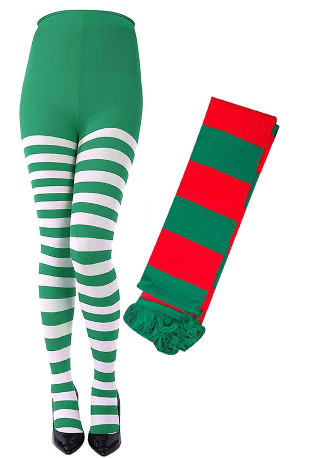 Christmas Green White Striped Tights Elf Scarf Santa Helper Xmas Fancy Dress