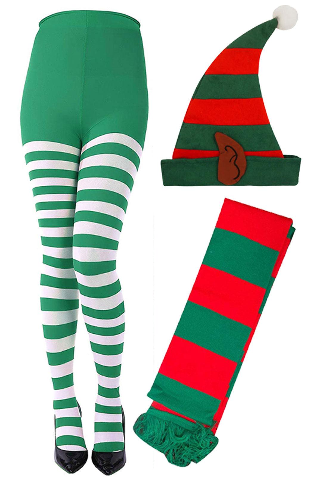 3 Pcs Set Includes: Striped Tights + Elf Hat + Scarf