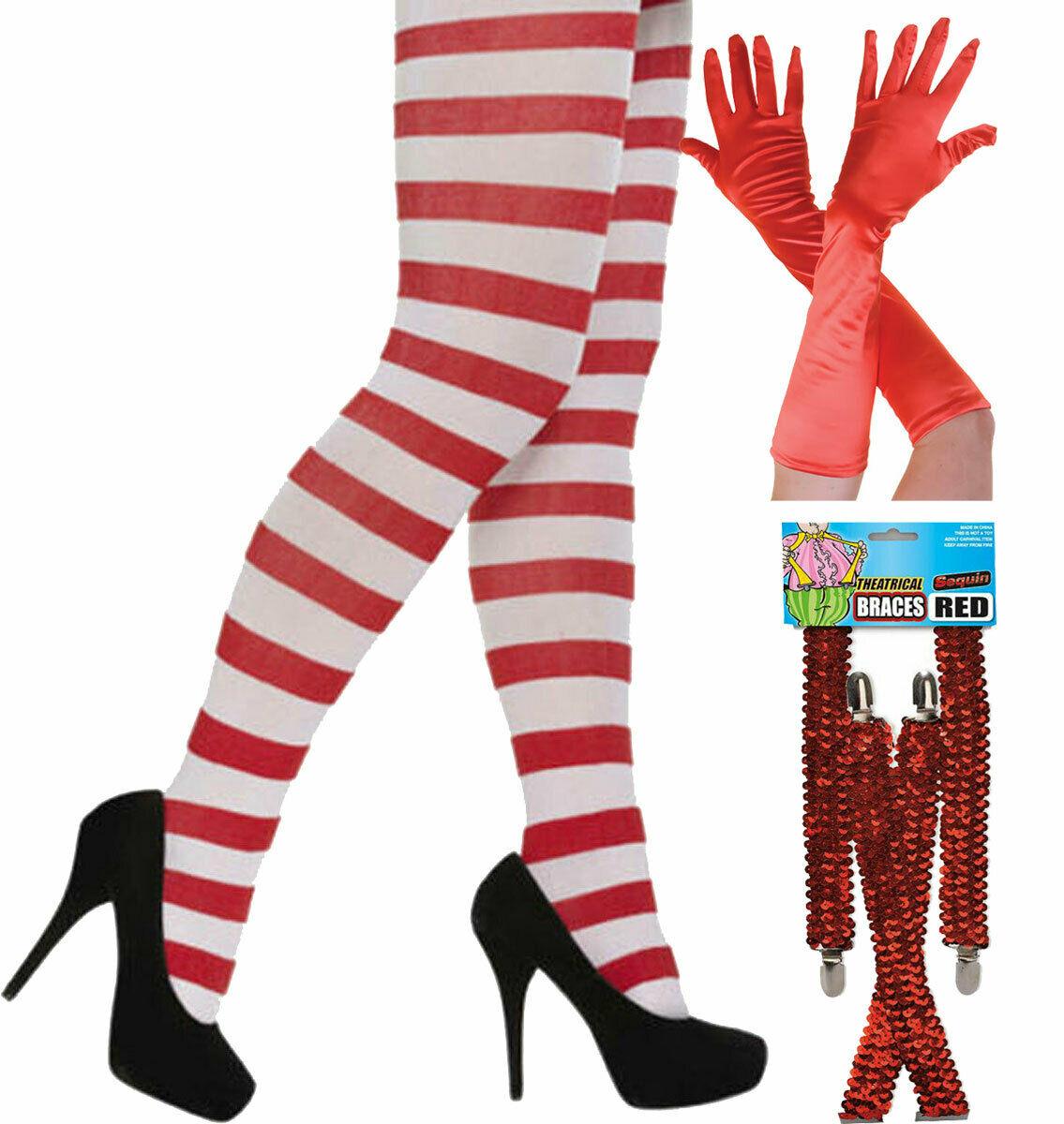 Set Includes: Red White Stripy Tights + Sequin Braces + Long Satin Gloves