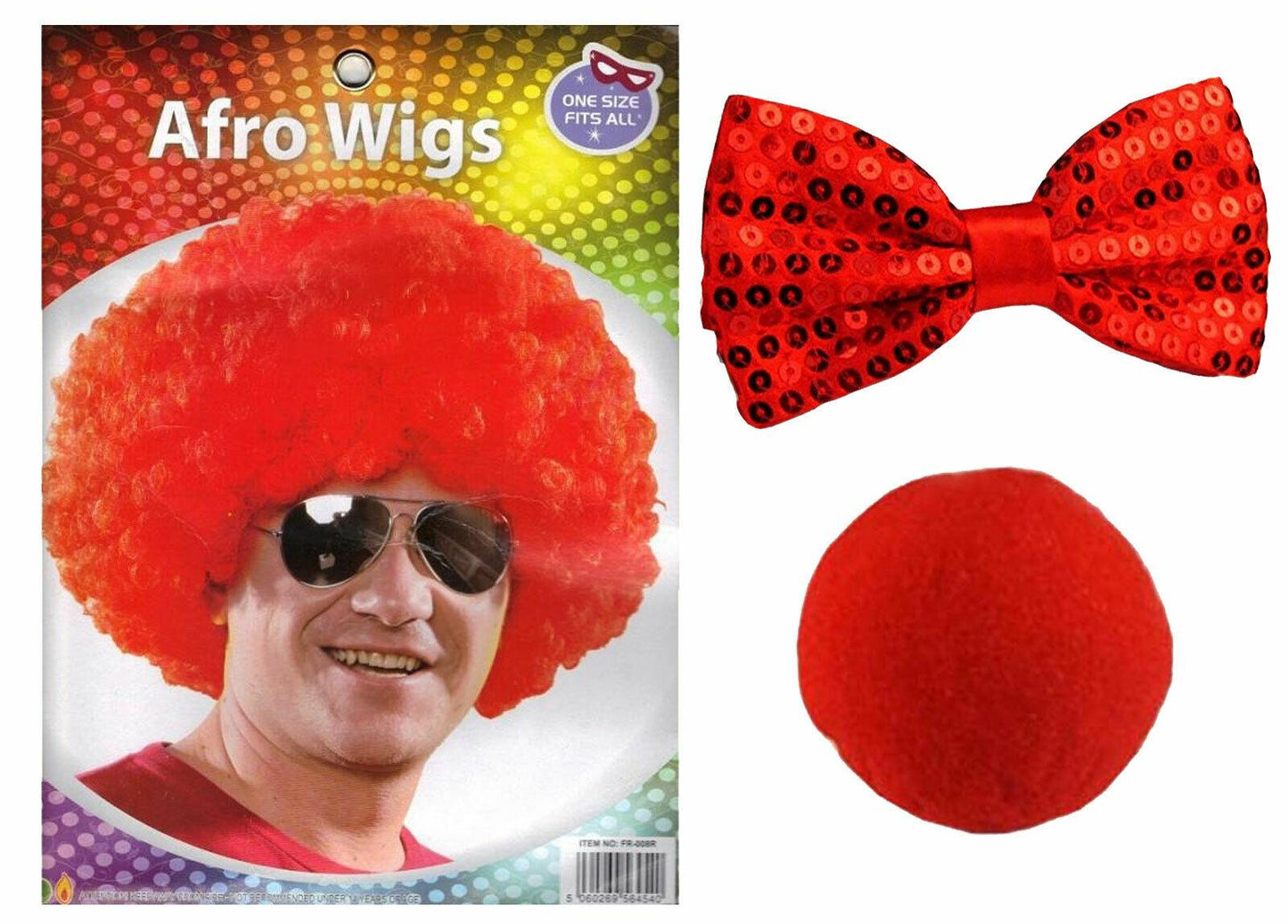 Package Include: Red Afro Clown Wig + Nose + Sequin Bow Tie