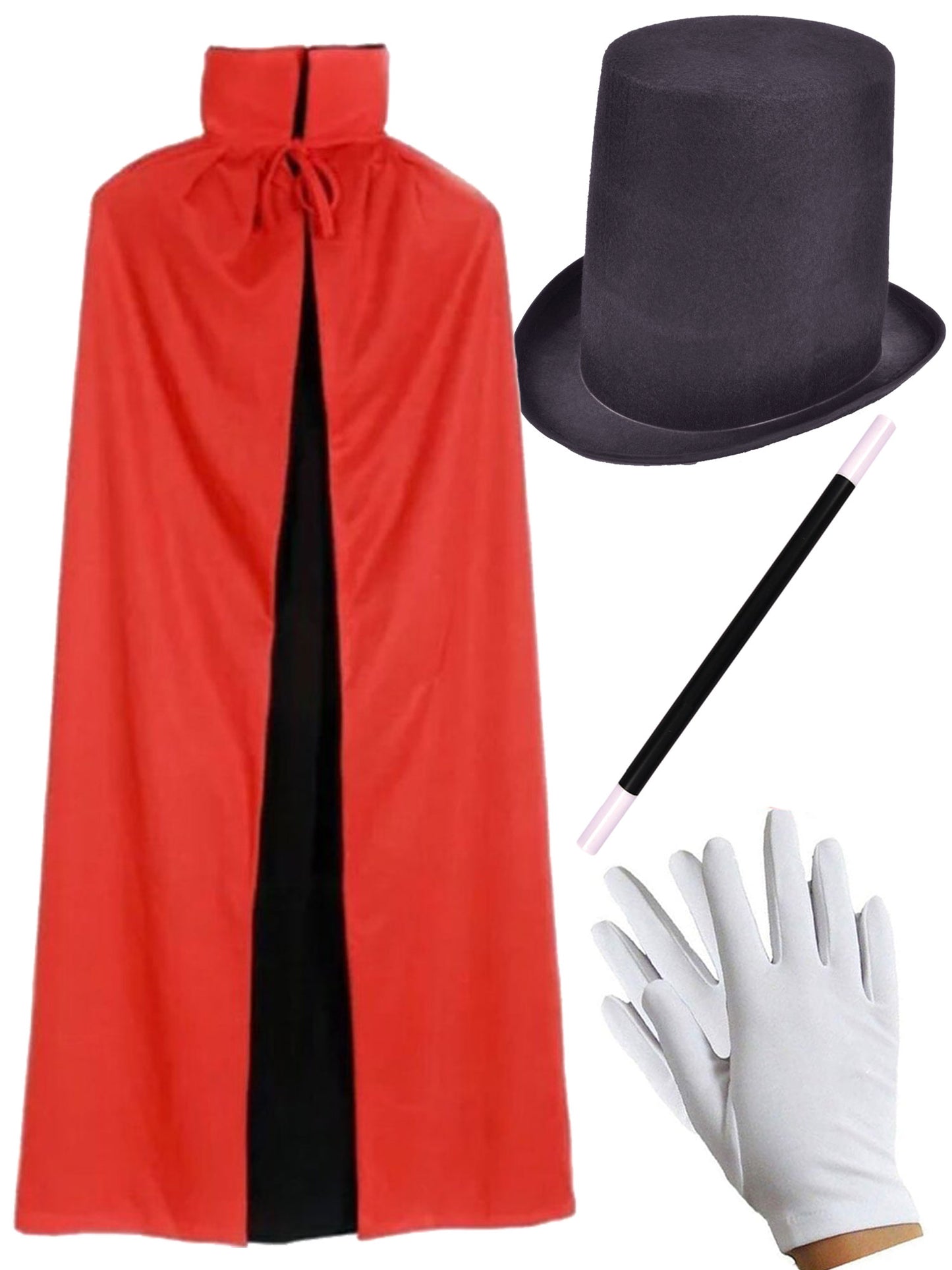 Complete Costume Set: Adult Reversible Cape, Stovepipe Top Hat, Magic Wand (26.5cm), White Gloves - Transform Your Look with Elegance and Enchantment
