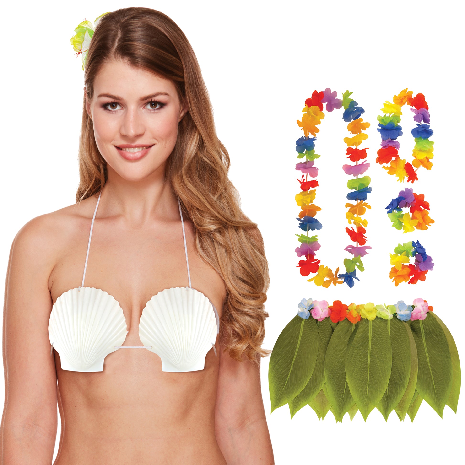 Complete Ensemble: This set includes a classic sea shell bra, a vibrant green leaf skirt, and colorful hula leis, ensuring you're fully prepared for your Hawaiian adventure.