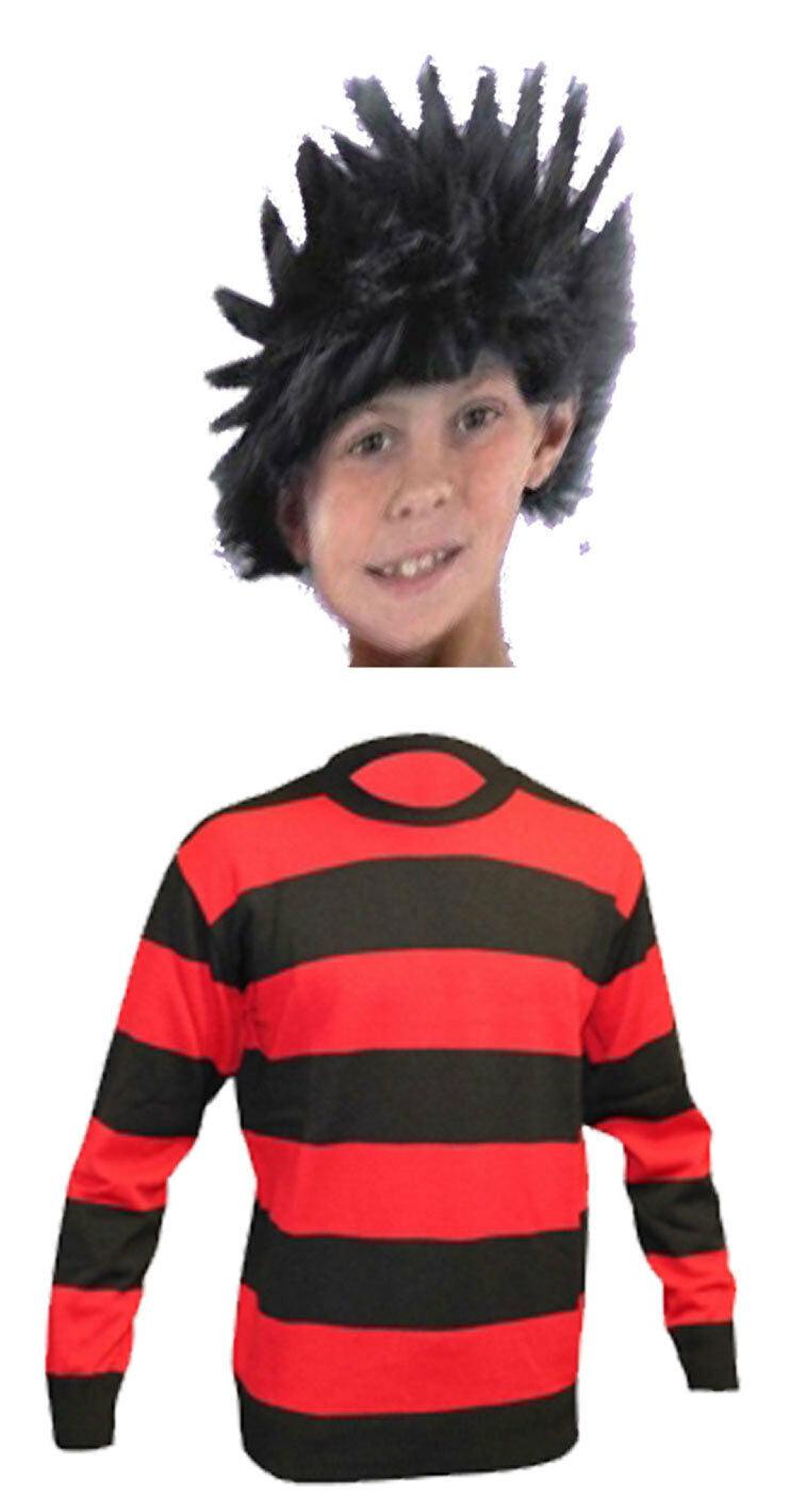 Kids Boys Knitted Black Red Striped Jumper & Spiky Black Wig Fancy Dress Set