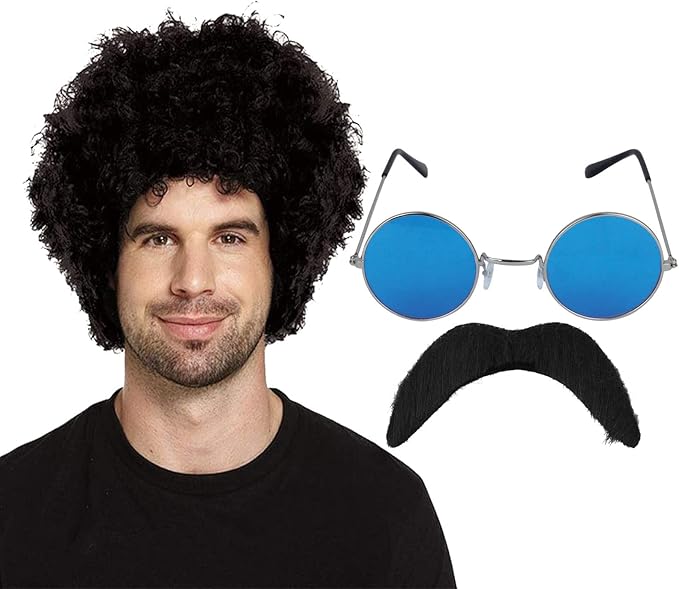 Dance your way into the spotlight with the Labreeze 1970s Afro Curly Wig, Blue Tinted Glasses, Fake Moustache | Funky Disco Party Costume | 3-Piece Set.