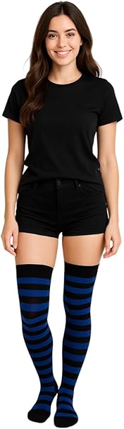 Includes 1 pair of black and blue striped over-the-knee socks featuring vibrant, contrasting colors.
