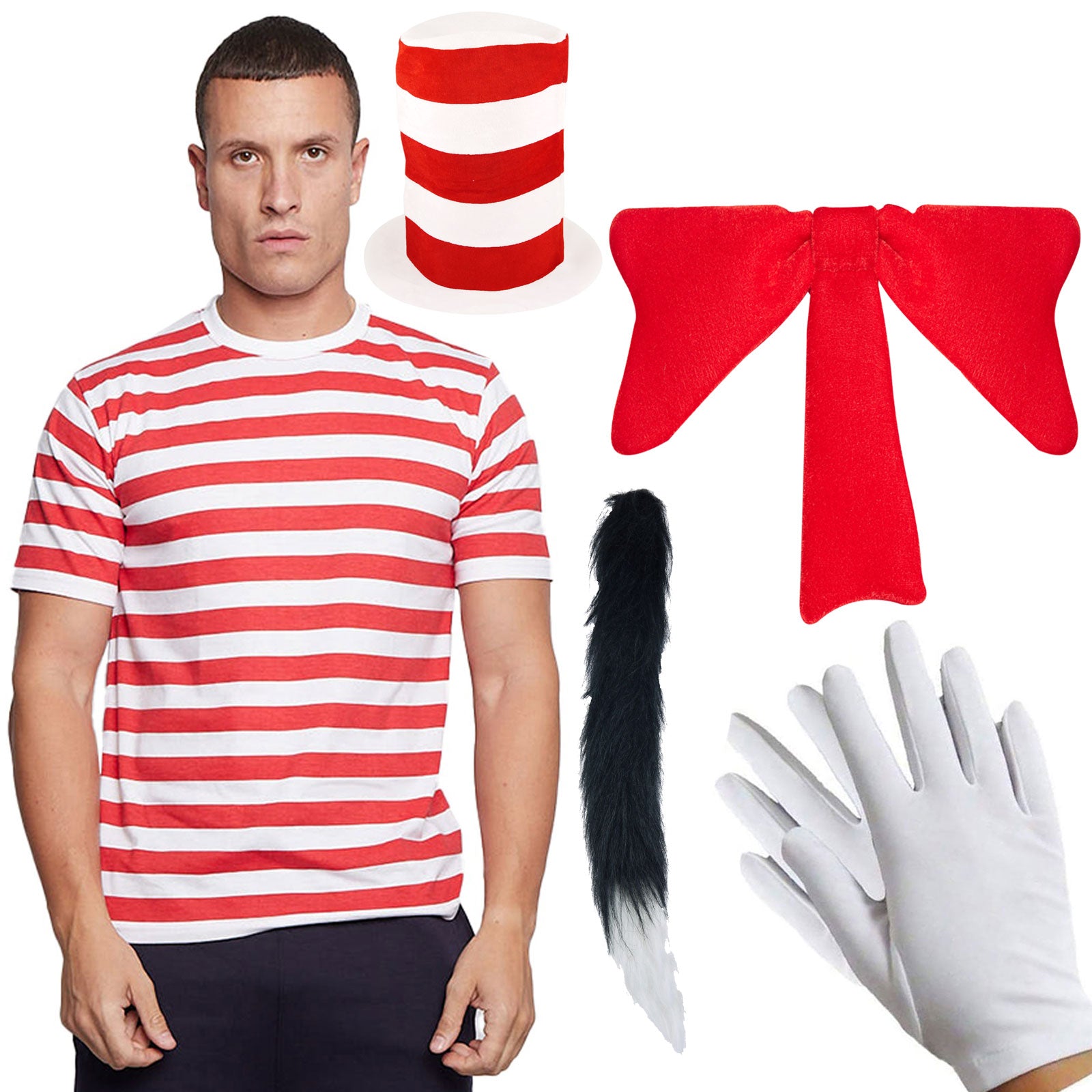 Labreeze Cat in the Hat 5-Piece Set – Red & White T-Shirt, Hat, Gloves, Bow Tie & Tail – World Book Day & World Book Week Fancy Dress Costume