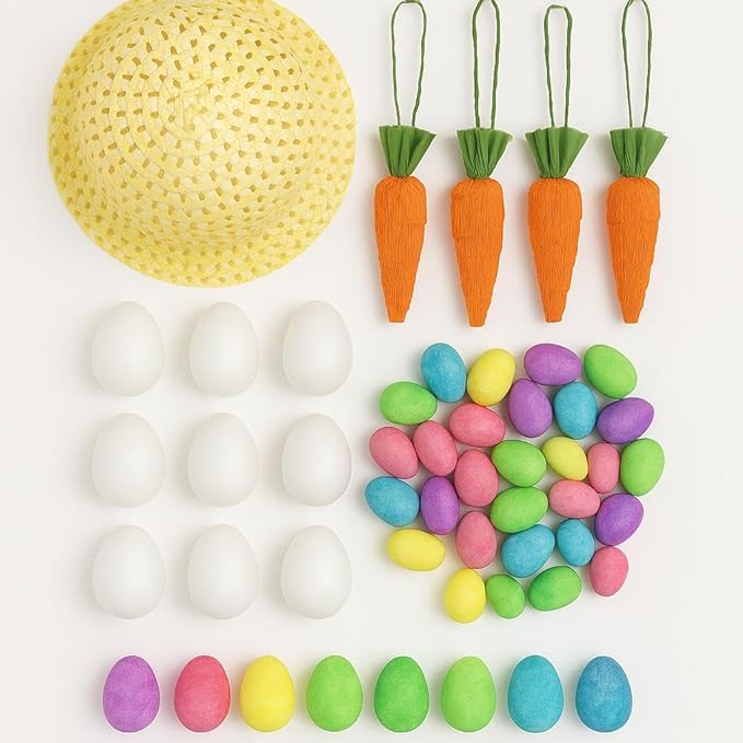 labreeze Children’s Bonnet Hat – DIY Craft Kit with 4 Carrots, Green Paper Rope, 8 Foam Eggs & 8 Glitter Eggs – Kids’ Fancy Dress Hat for Parades & School Competition