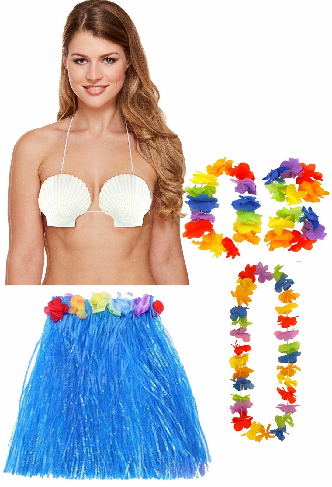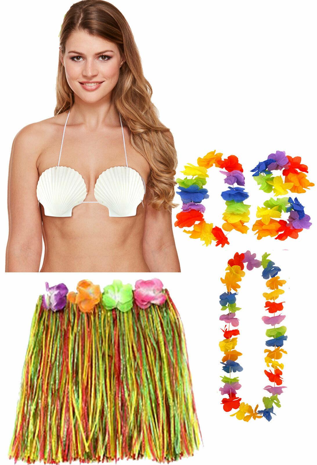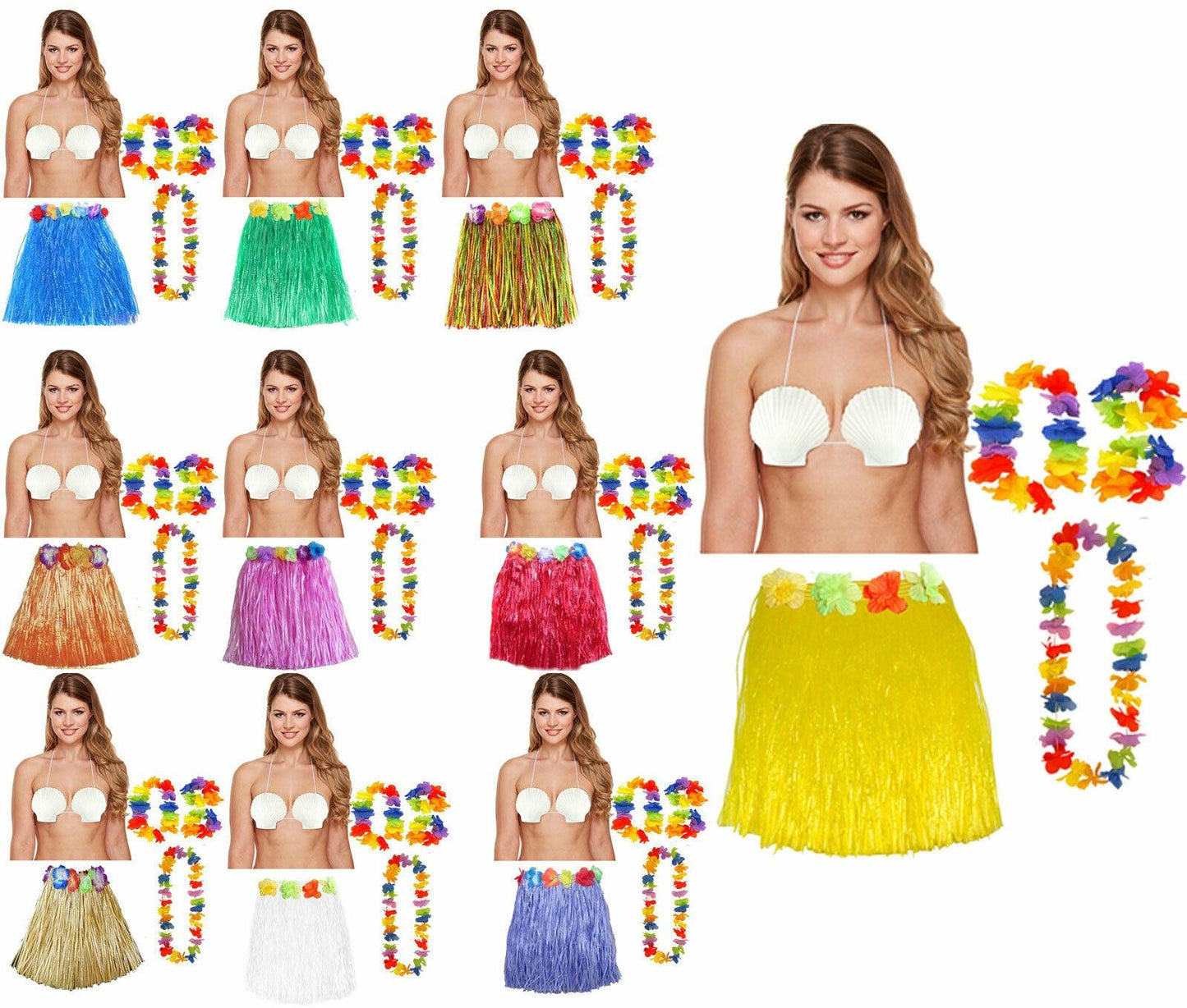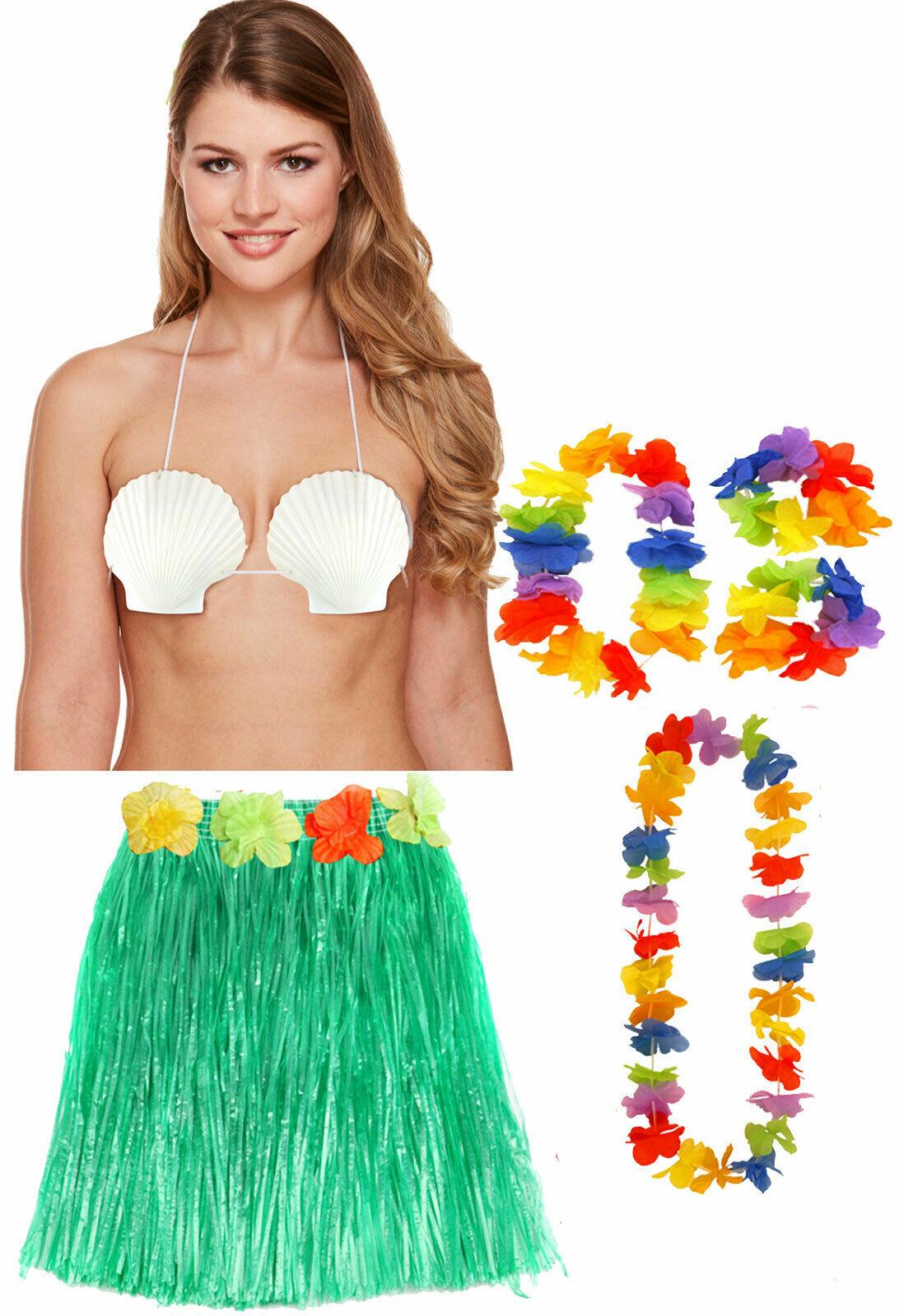 Ladies 40 cm Hula Skirt Lei Set Shell Bra Hawaiian Summer Beach Party Costume