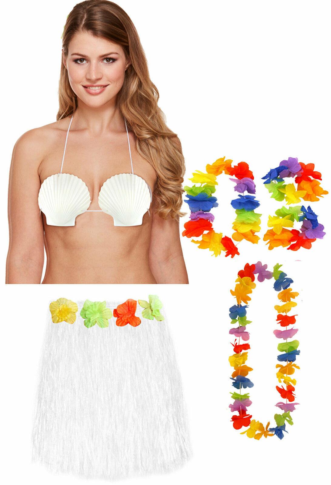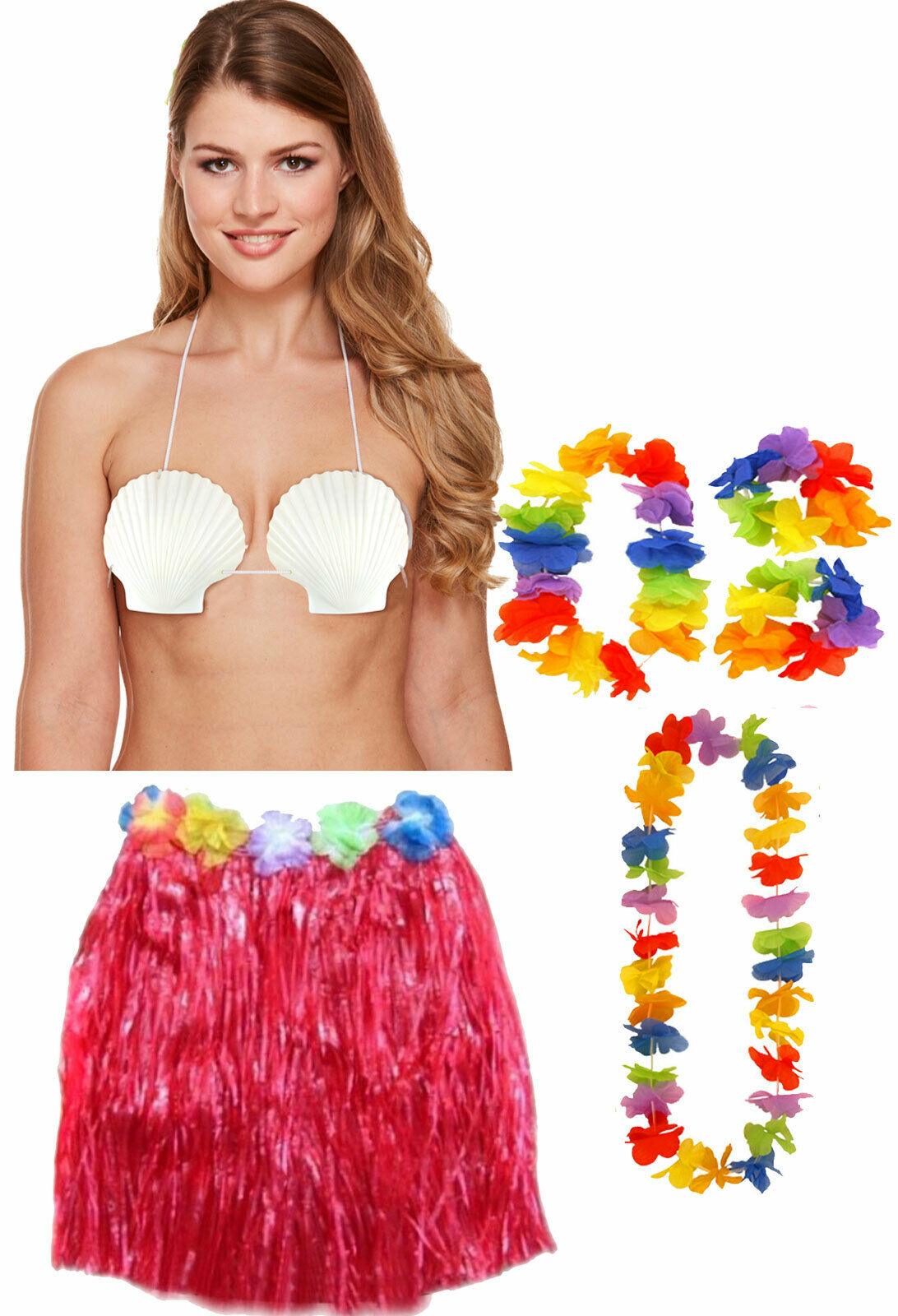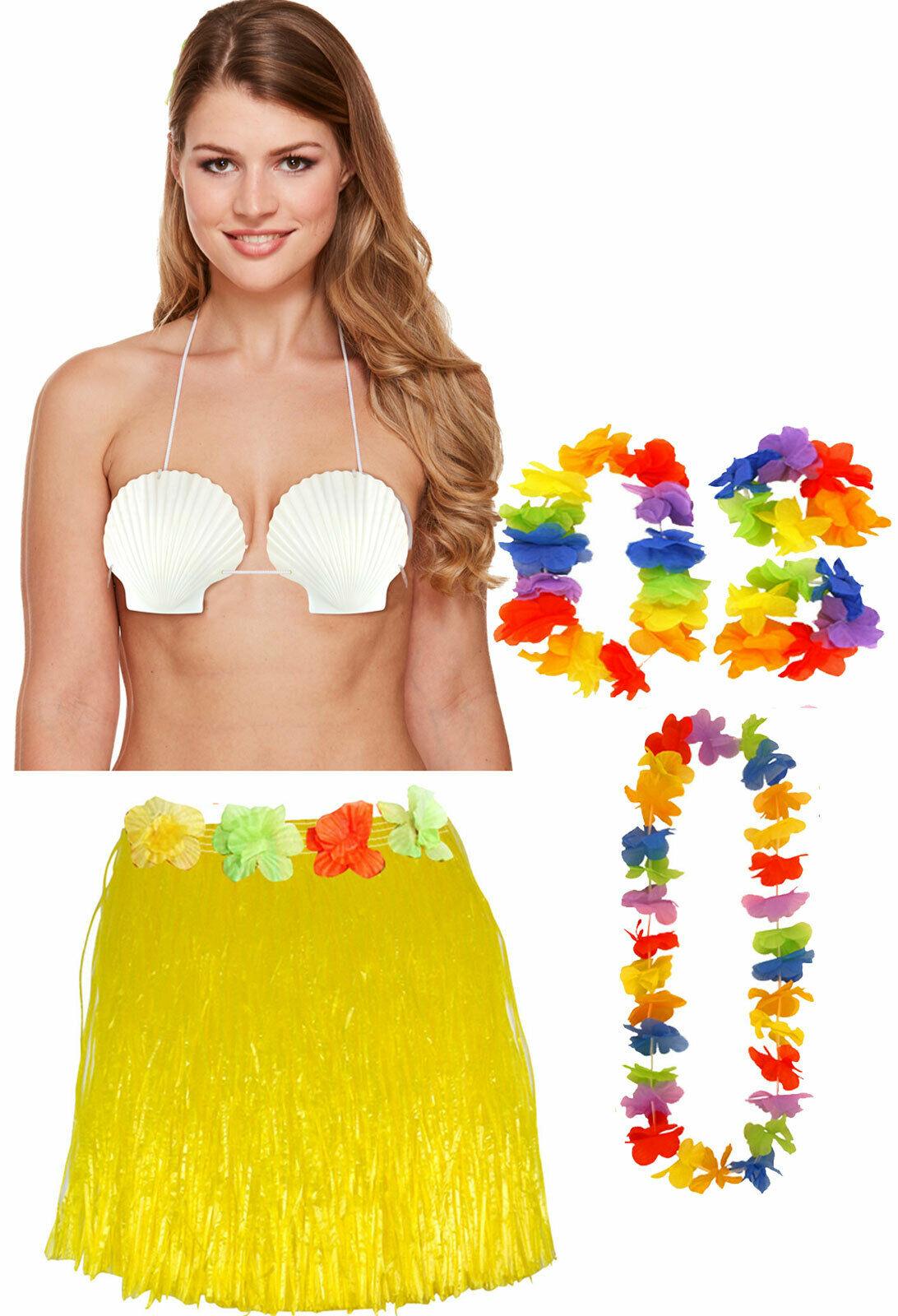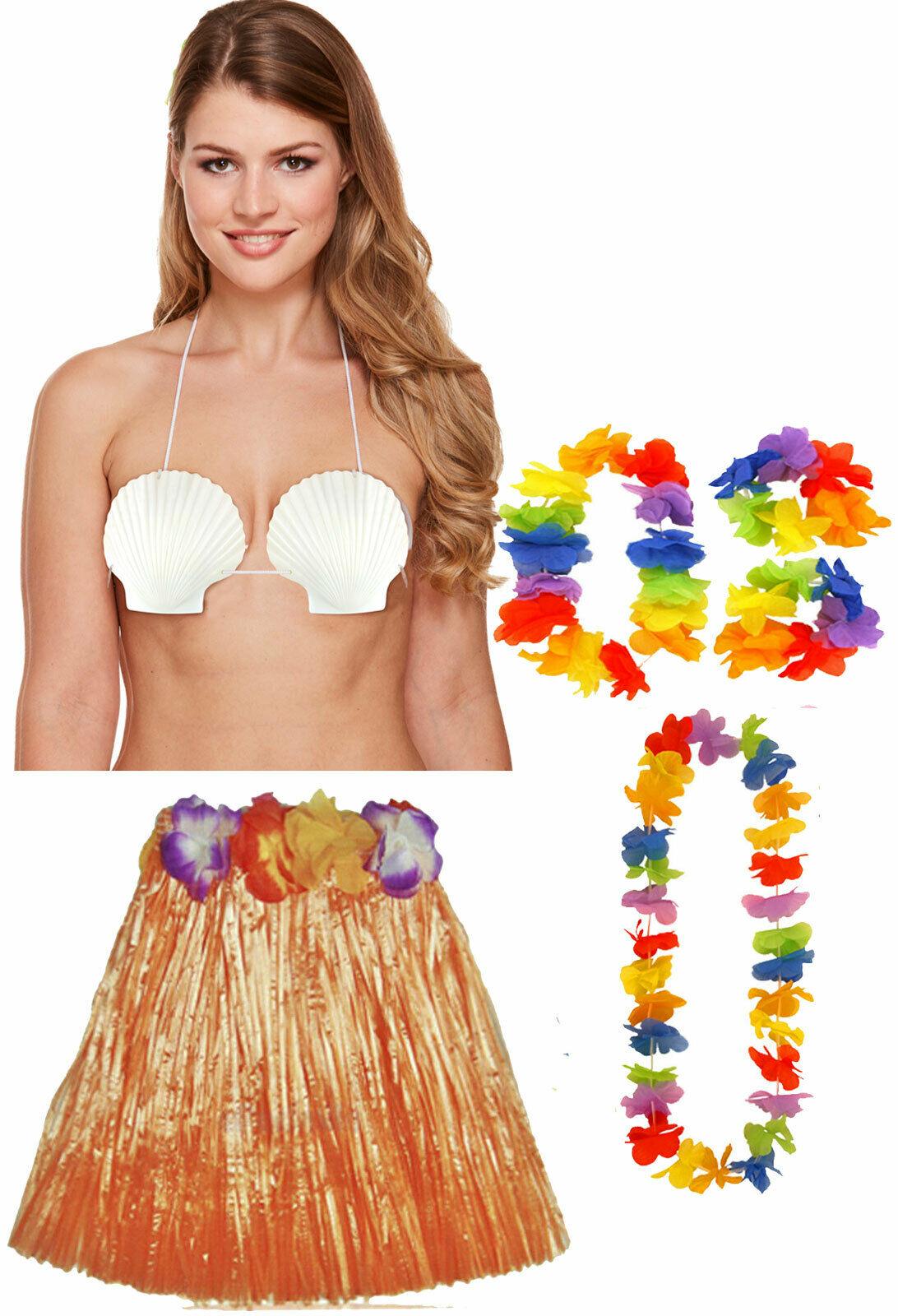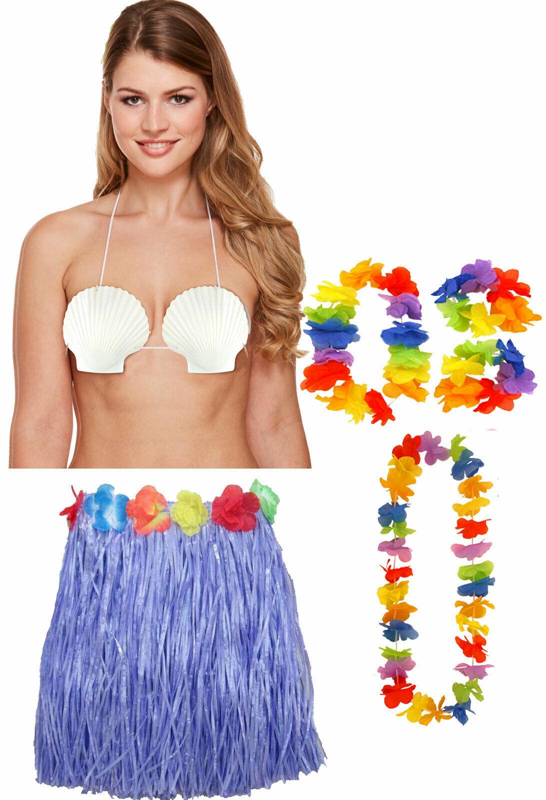 Ladies 40 cm Hula Skirt Lei Set Shell Bra Hawaiian Summer Beach Party Costume