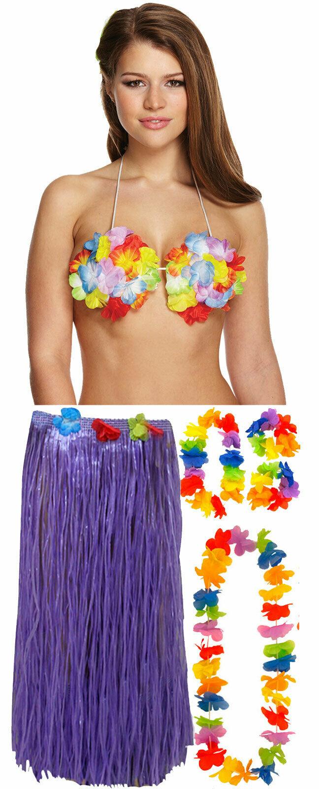 Set Includes: Hula Skirt 80 cm + Flower Bra + 4 Pcs Lei Set