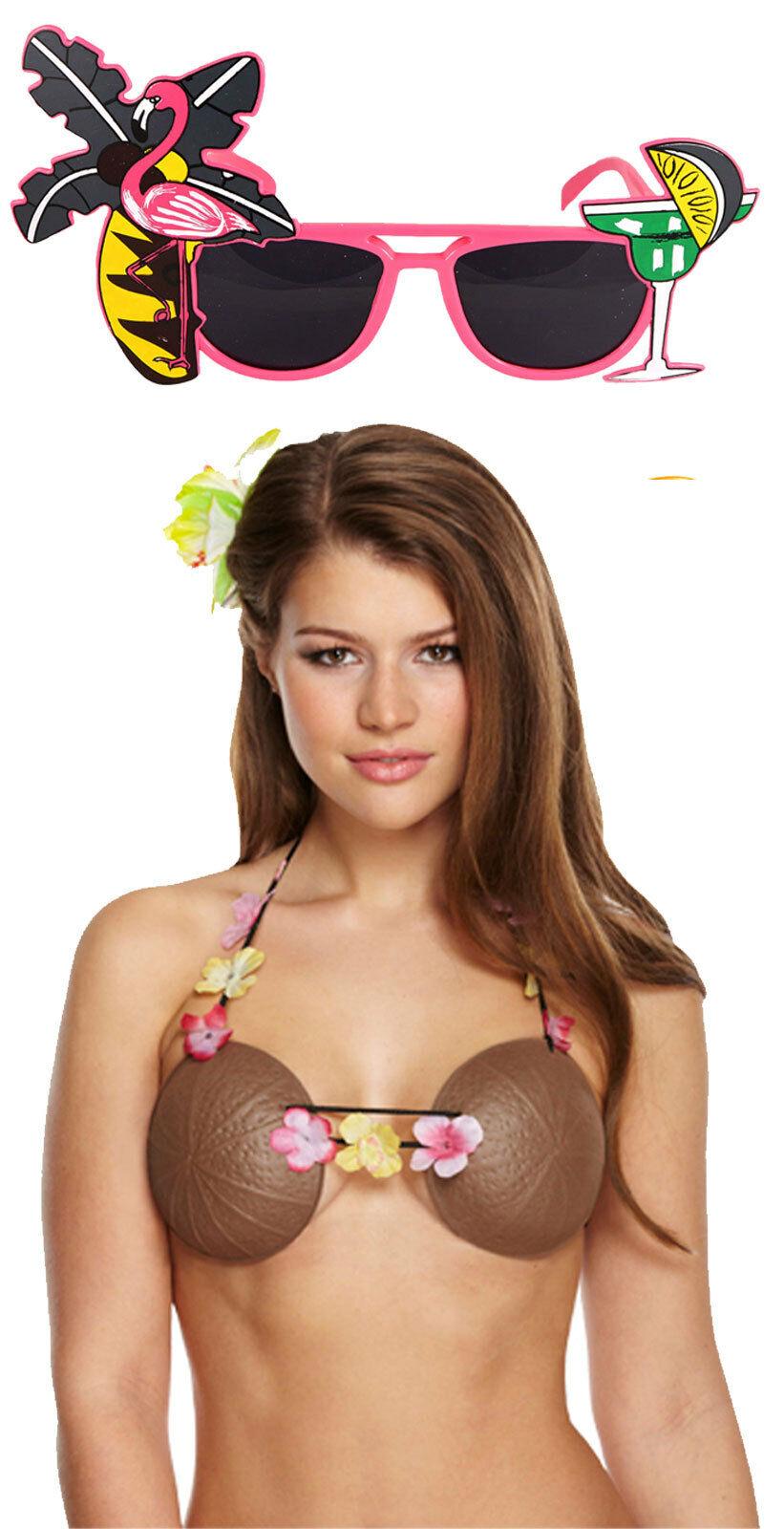 Ladies Brown Coconut Bra Pink Flamingo Sunglasses Hawaiian Party Fancy Dress