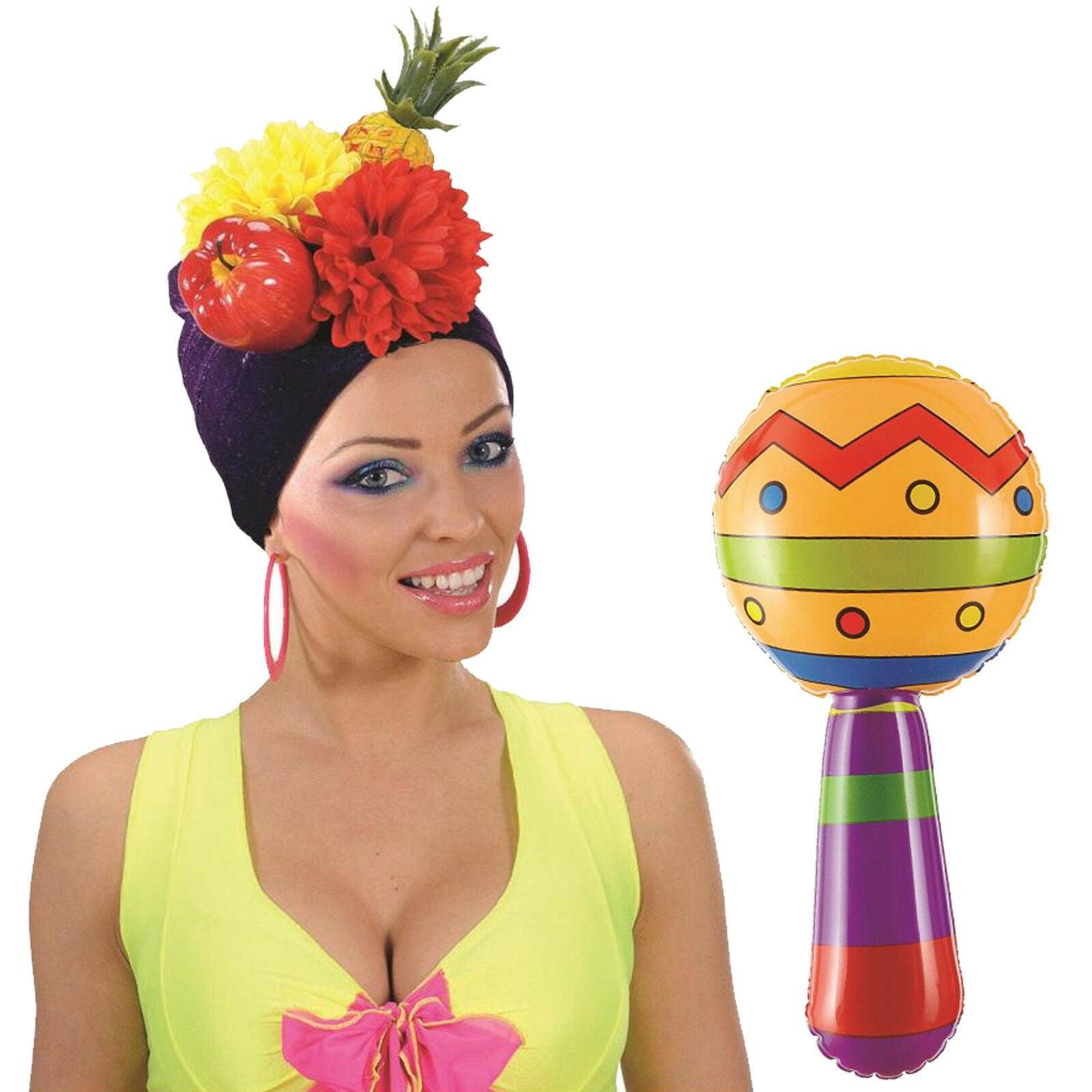 Ladies Carmen Miranda Hat Brazil Fruit Turban Inflatable Maraca Fancy Dress Set