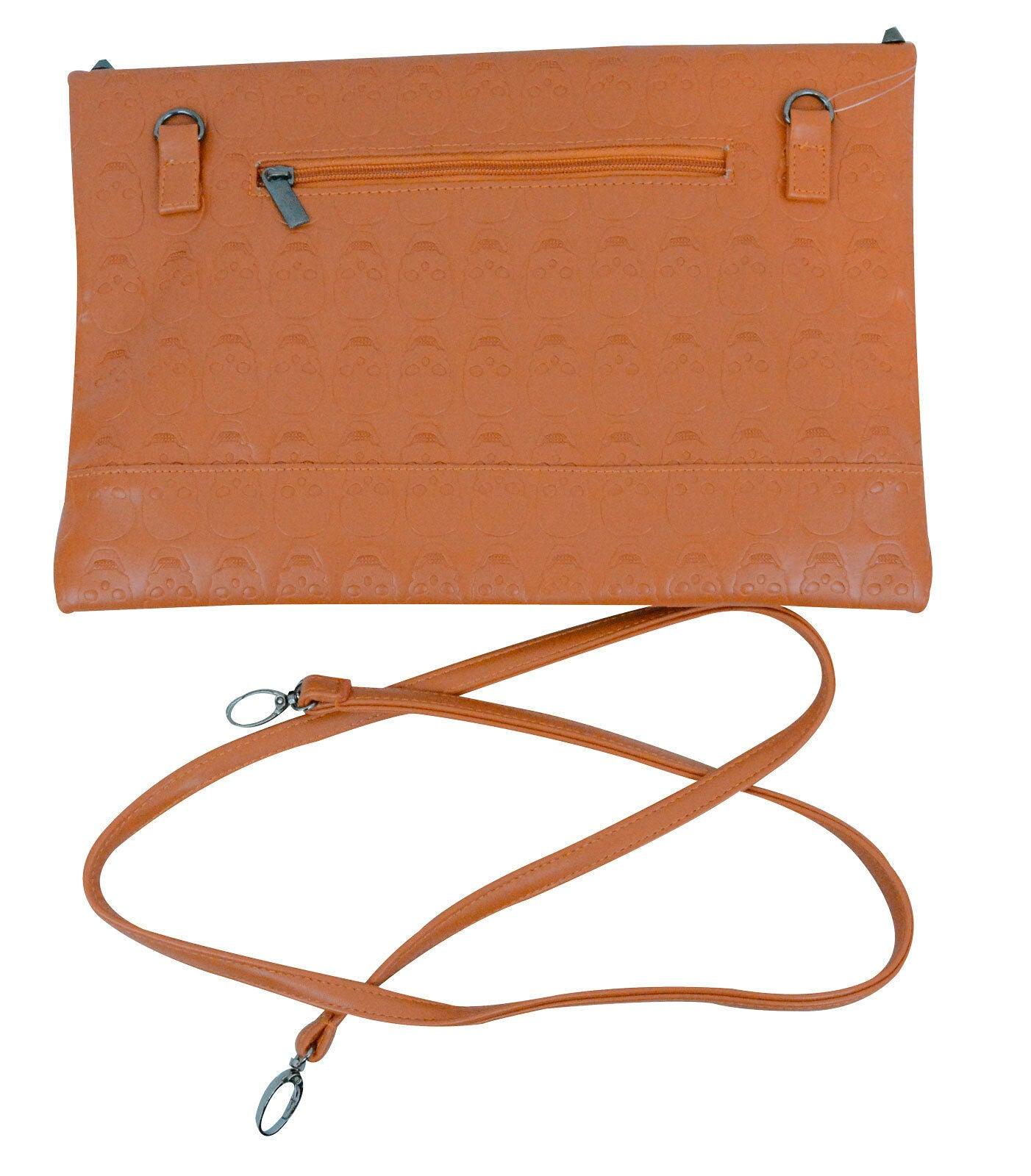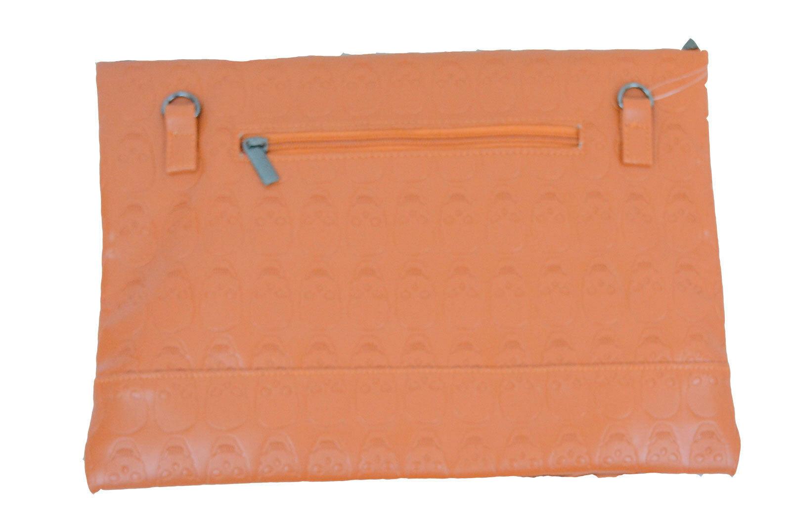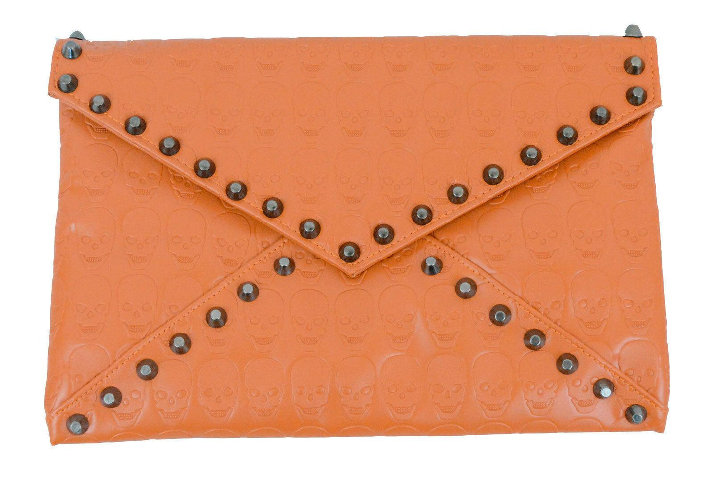 Spice up your evening with this envelope clutch purse. It is made of vinyl and textured with embossed skulls, it measures 13 inches long, 9 1/2 inches tall and features hematite stud accents. It also comes with an adjustable 1/2 inch wide detachable shoulder strap. The interior is lined with black satin, has a slip pocket for your phone or keys, and the bag secures with a magnetic snap closure. There is also a small zipper compartment on the back of the bag for quick access to important items.