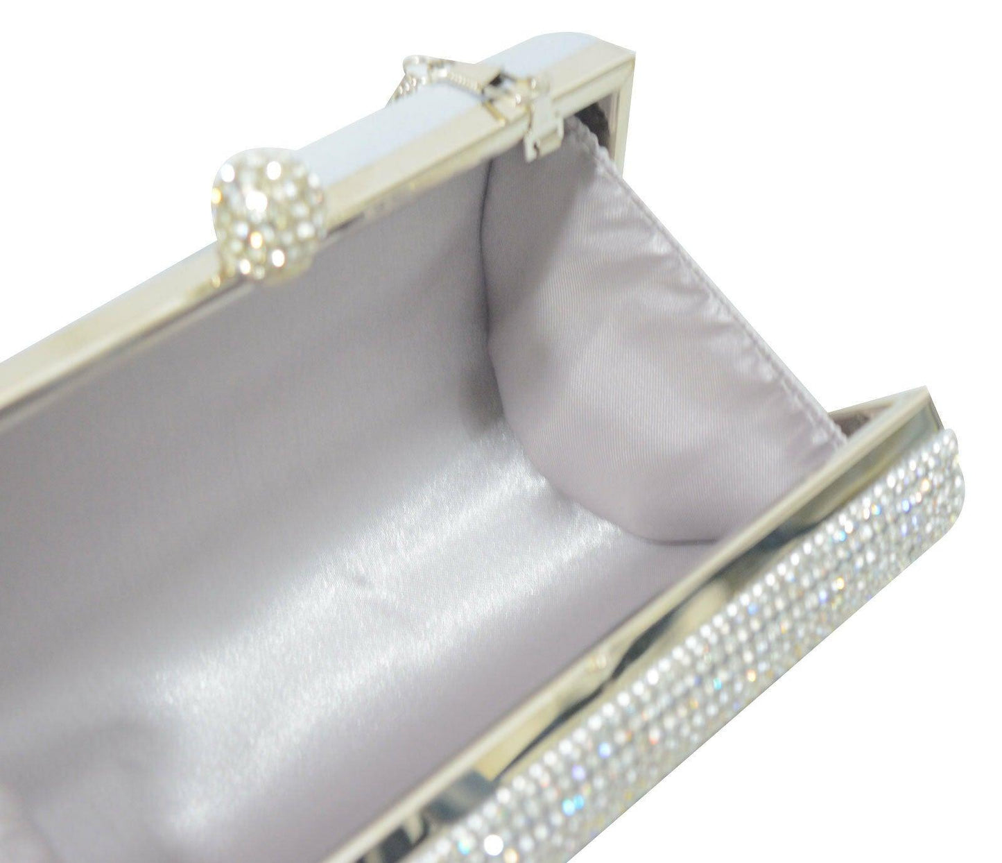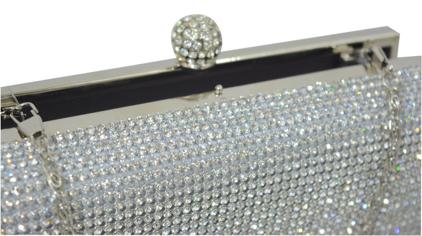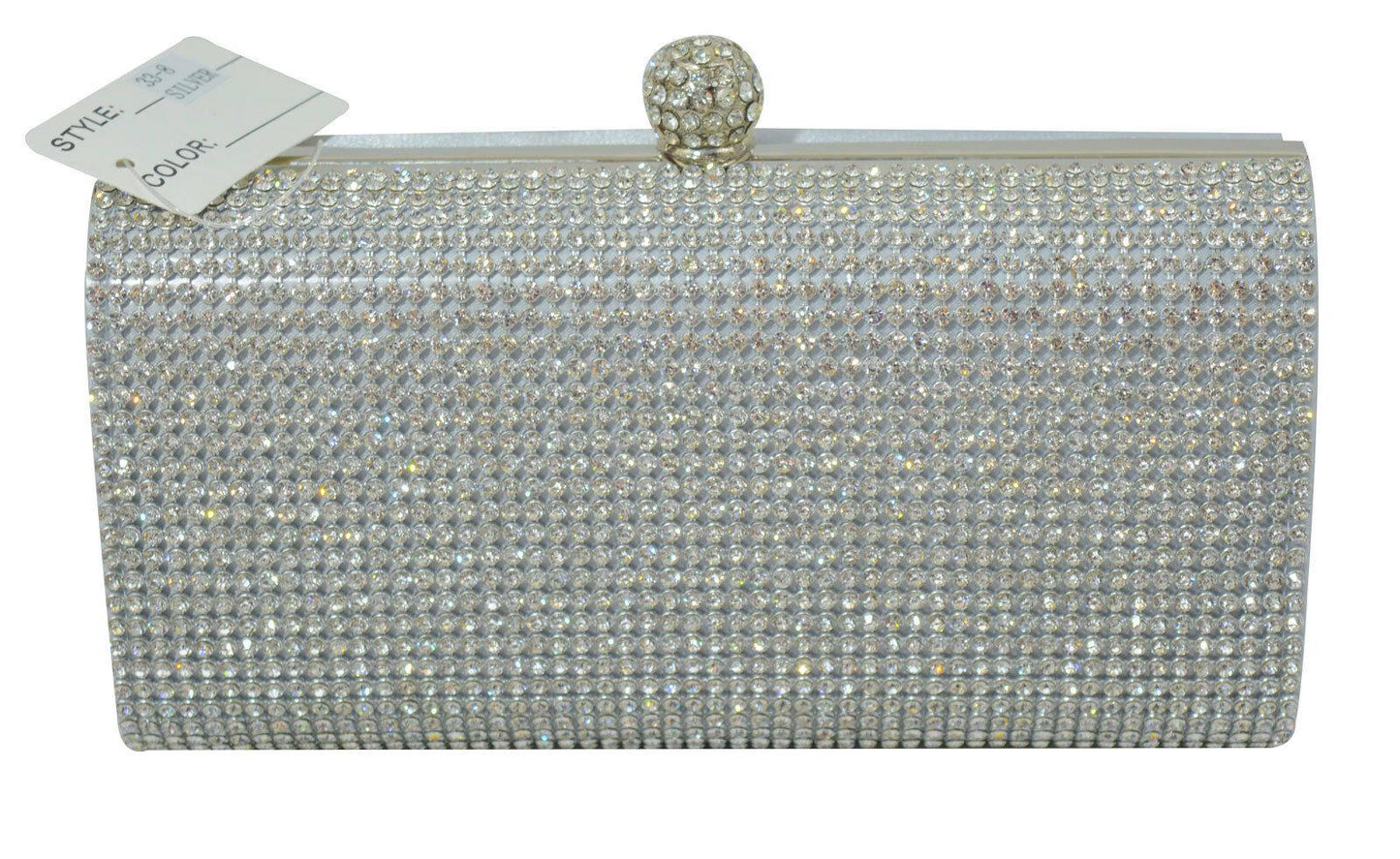 You are looking at Shimmering silver Sparkly Diamante Encrusted Shiny Evening Bag. This gorgeous bag is silver with hard case and round crystal diamante detail, with mirrored sides, compact but elegant. Front of Bag Is Encrusted With Sparkling Diamantes Crystals. It is a 3 style in 1 bag (shoulder, clutch, and purse) handbag. Perfect for special events, weddings or just simply evening out.