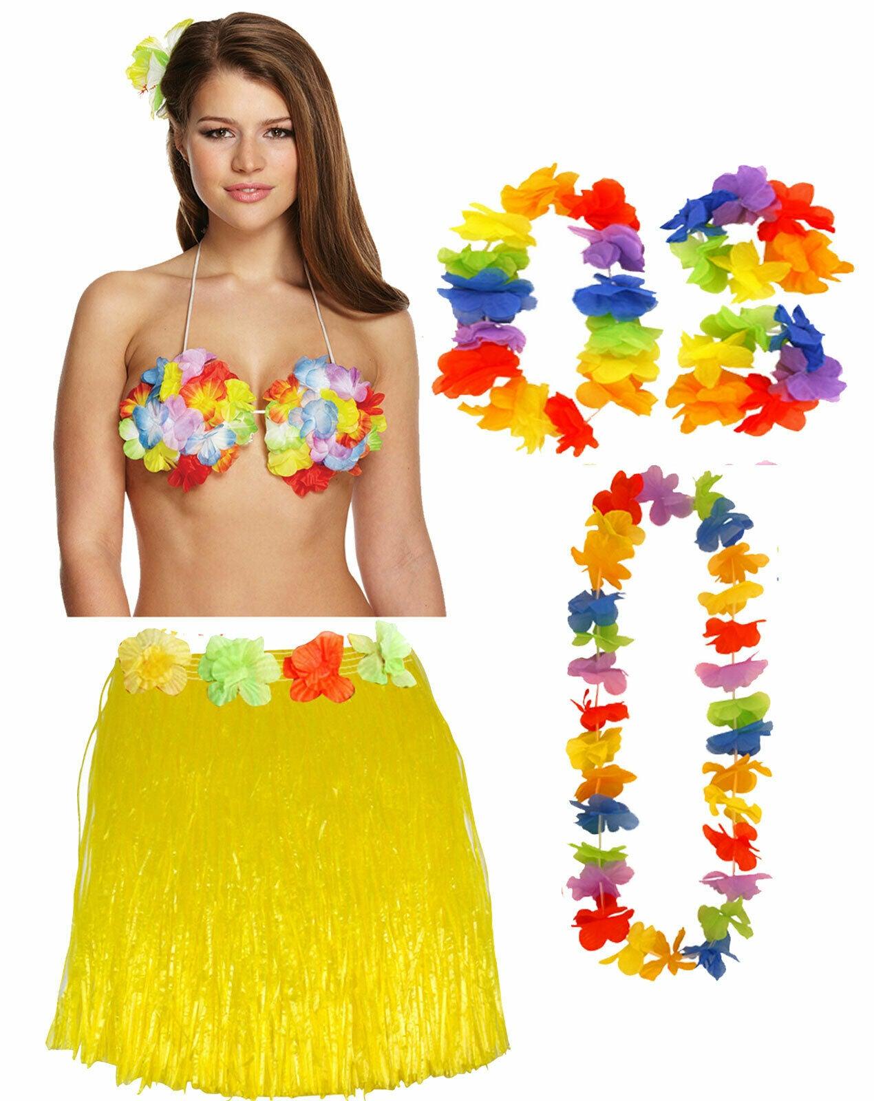 Ladies Girls Yellow 40 Cm Hula Skirt Lei Flower Bra Hawaiian Summer Party Dress