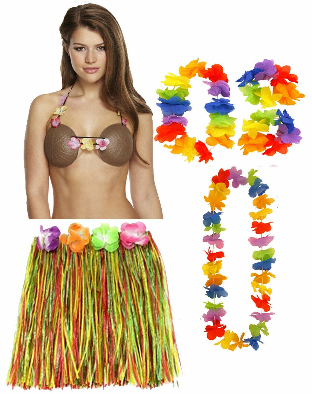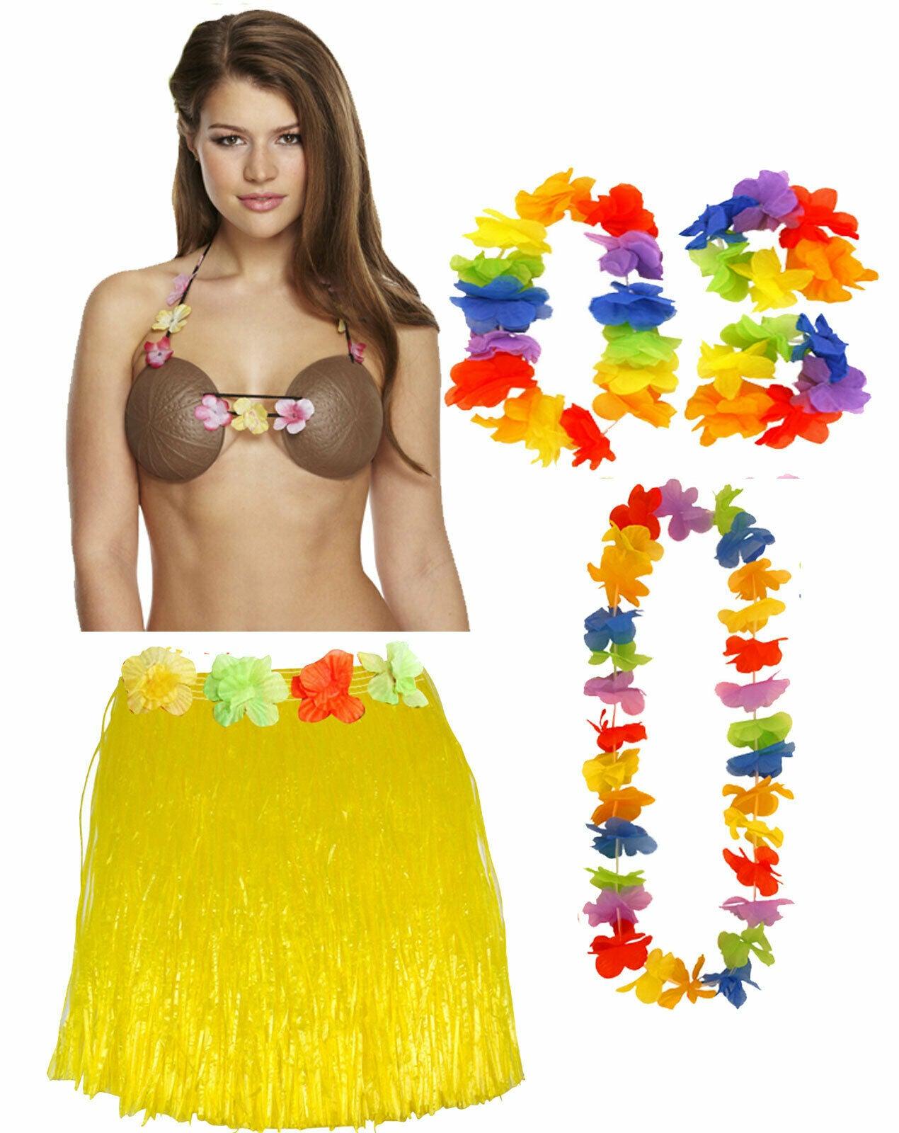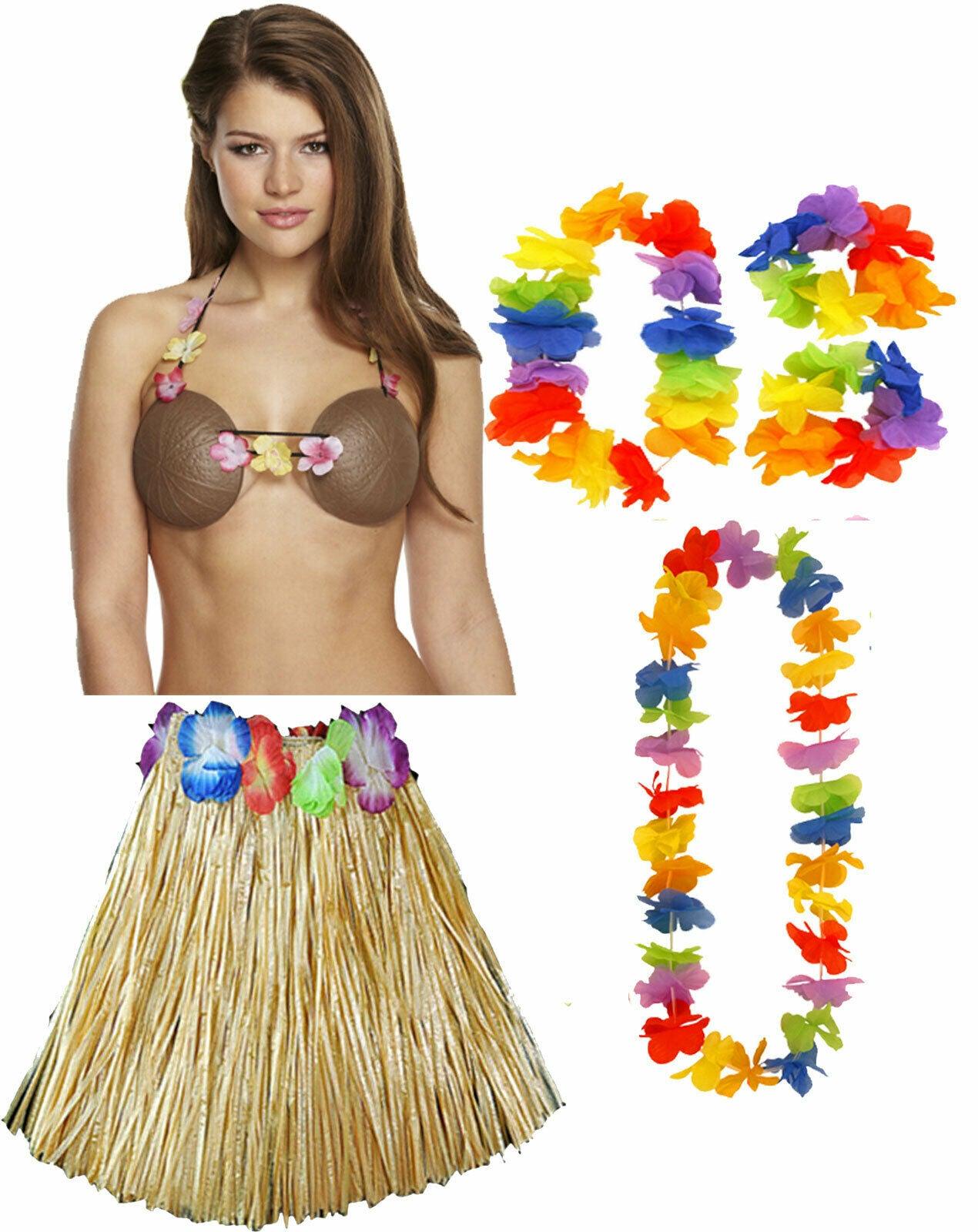 Ladies Hula Skirt 40 cm 4 Pcs Lei Set Coconut Bra Hawaiian Beach Party Fancy Dress
