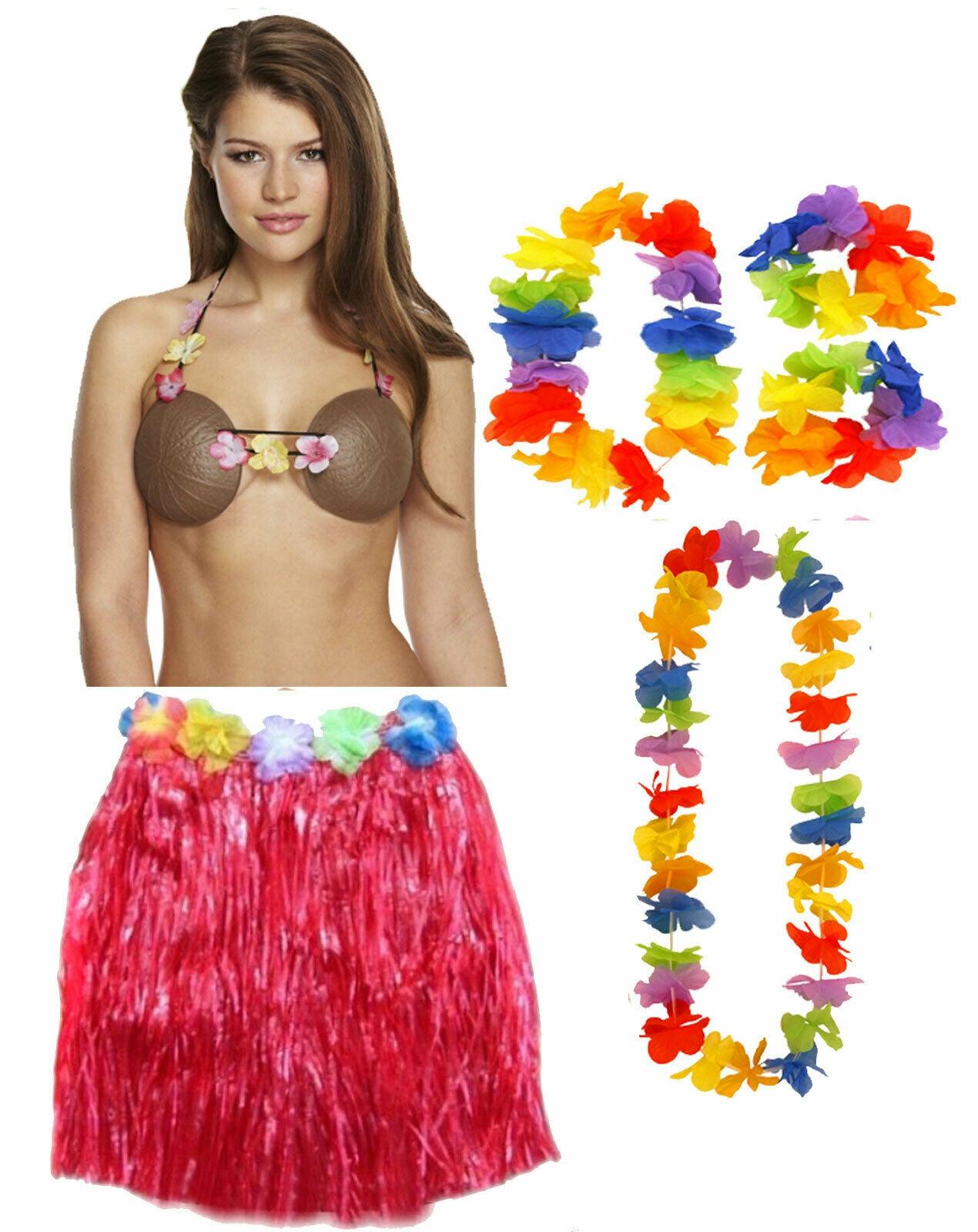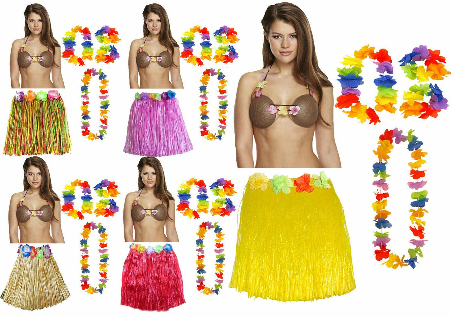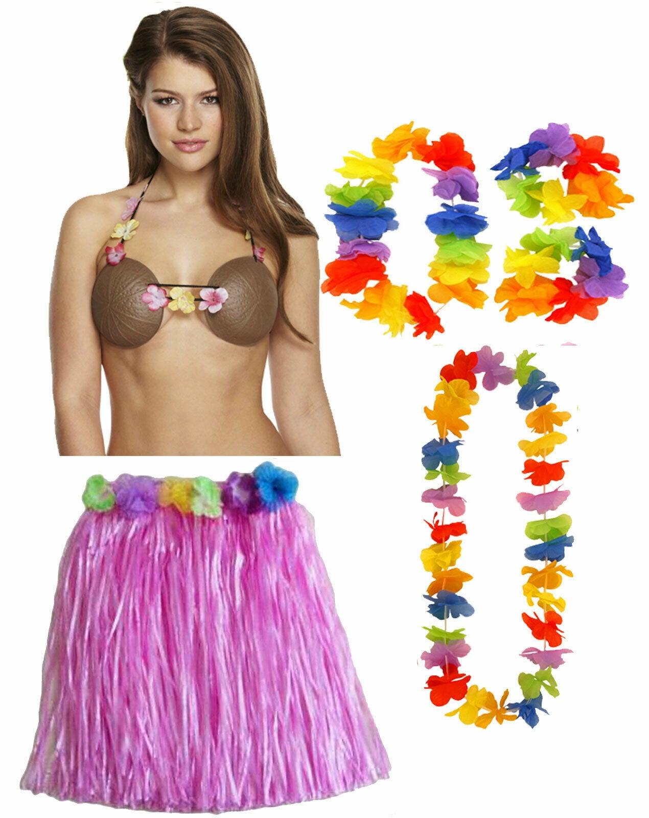 Ladies Hula Skirt 40 cm 4 Pcs Lei Set Coconut Bra Hawaiian Beach Party Fancy Dress