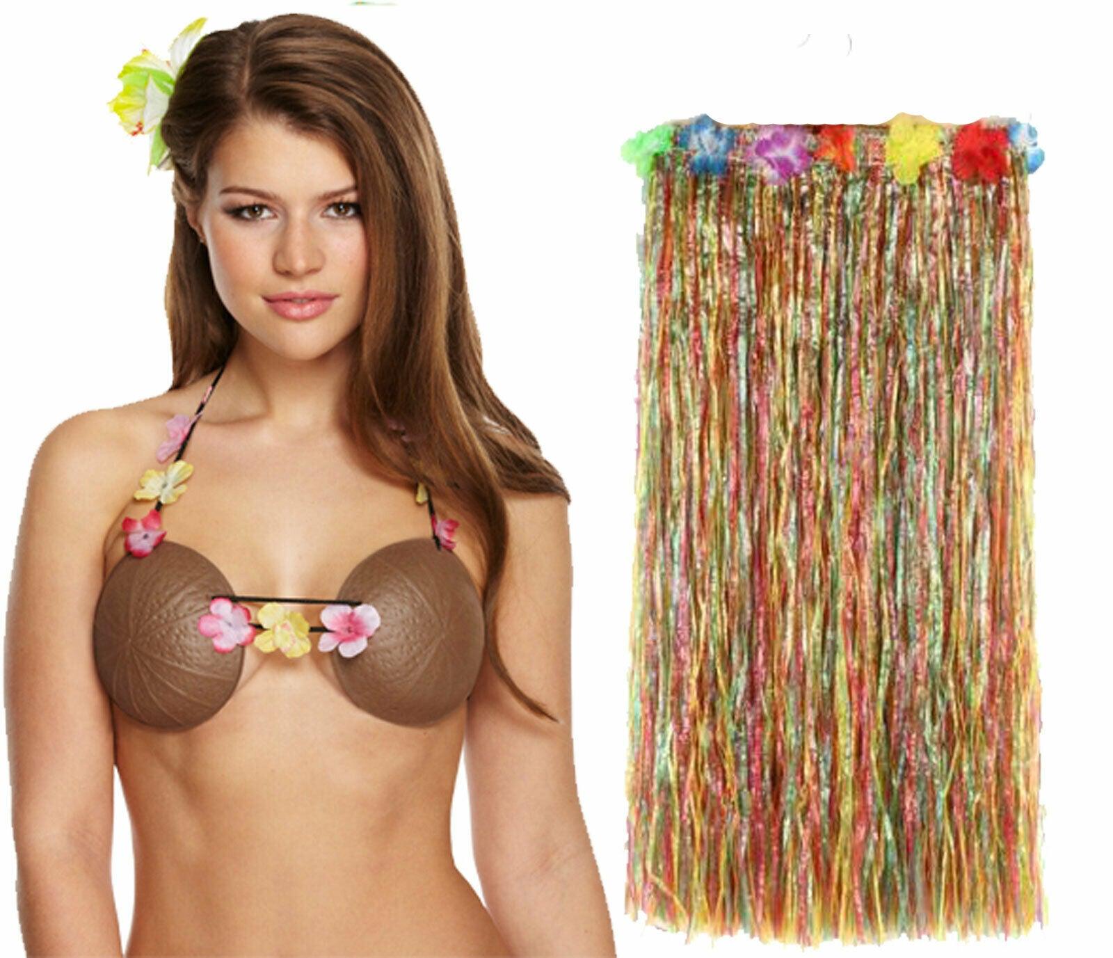 Ladies Plastic Coconut Bra with Multi Hula Skirt Hawaiian Beach Party Set