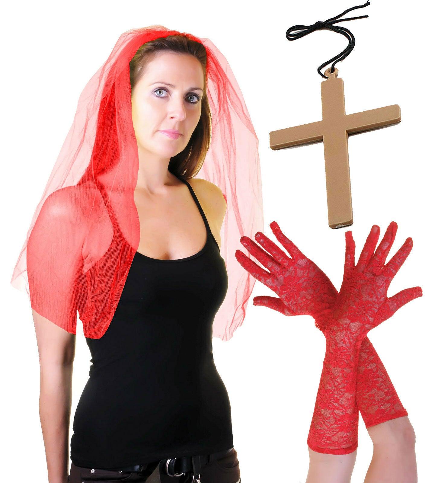Ladies Red Veil on Hair Band Long Lace Gloves Monk Cross Prom Fancy Dress