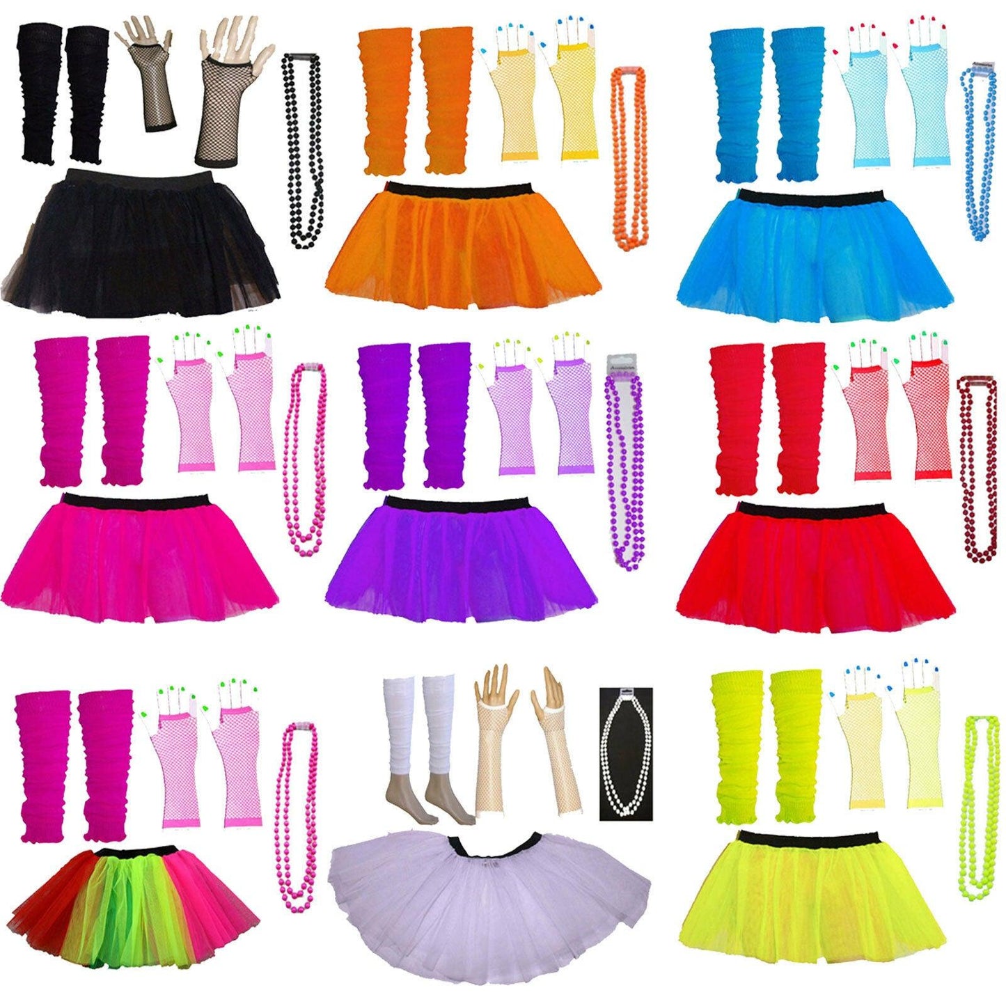 Step ahead of fashion with these Ladies Girls Tutu Skirt Gloves Leg Warmers Beads 1980’s Party Hen Night Party Costume. These comes in many eye catching colours and a complete set with matching gloves legwarmers and beads for your ideal party costume Gloves, Beads and Leg Warmers are size one which fits all. Ideal for Dance Wear, Halloween Party, Christmas Party, Neon Party and hen night party.